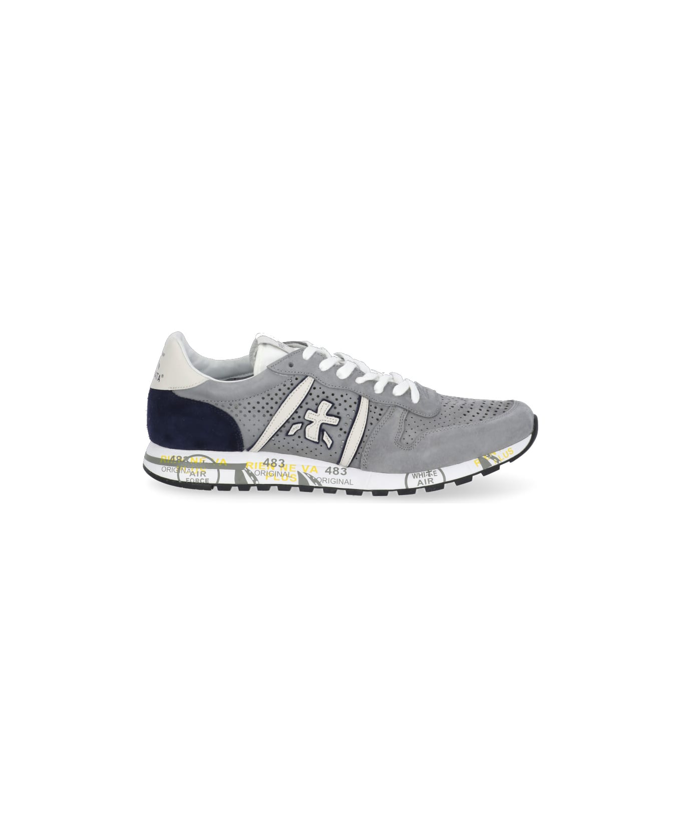 Eric 6141 Sneakers from Premiata: - Grey White Premiata suede leather sneakers for man - Round toe - All over breathable details - Logoed tongue - Side contrasting color logo - Contrasting color logoed upper heel - Laces fastening - Sole with contrasting color lettering