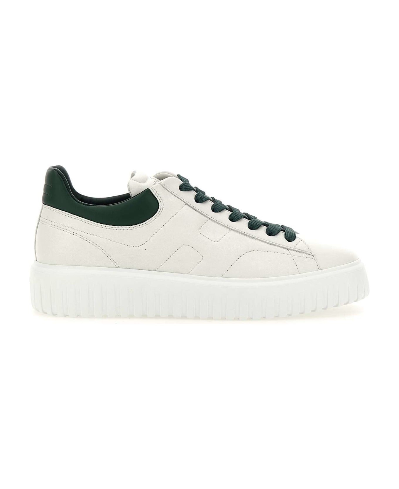 Hogan men's nappa sneakers "H-Stripes", white with green profiles, smooth leather inserts, side H visible stitched, gold logo on padded tongue, fussbe 8 mm memory foam, extralight EVA sole with vertical stripes with waves on tread. total height 5. 8cm. Care and maintenance instructions included. Fabric case and additional laces included. Made in Italy.