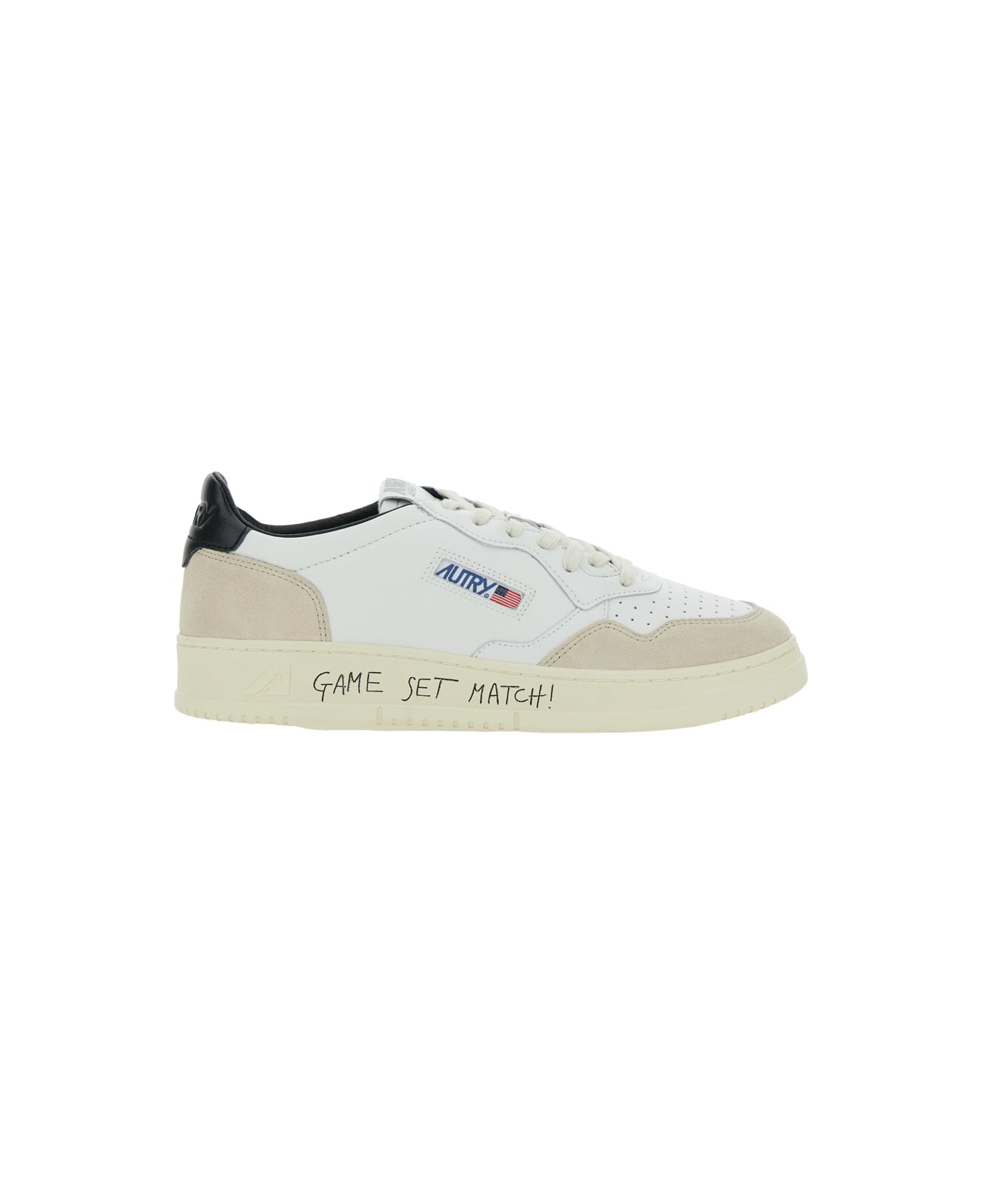 Sneakers White Low top Round and perforated toe Flat and white laces Black heel tab with embossed logo Side logo patch 'Game Set Match! ' writing Rubber sole Beige suede details Leather