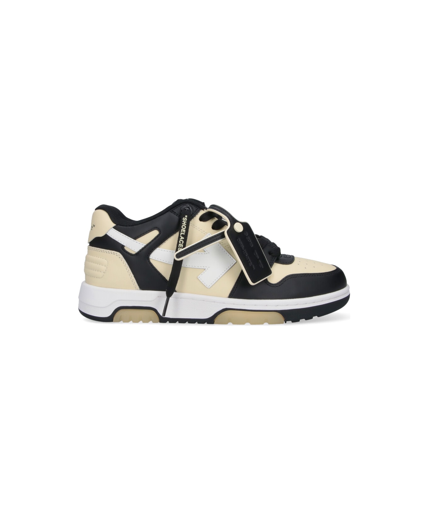 Off-White "out of office" sneakers in yellow "Glow In The dark" leather, round toe, lace-up closure, iconic engraved logo tag detail, logo patch on tongue, contrast leather "Arrow" logo patch on the side, leather back tab with white logo print detail, rubber sole.