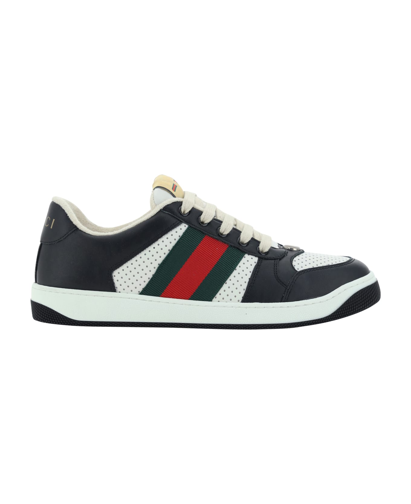 Calfskin screener sneakers by gucci featuring lace-up front closure, paneled design, side bands with iconic brand colors made from webing, flat sole, embossed iconic gg logo plaque on front, perforated round toe.