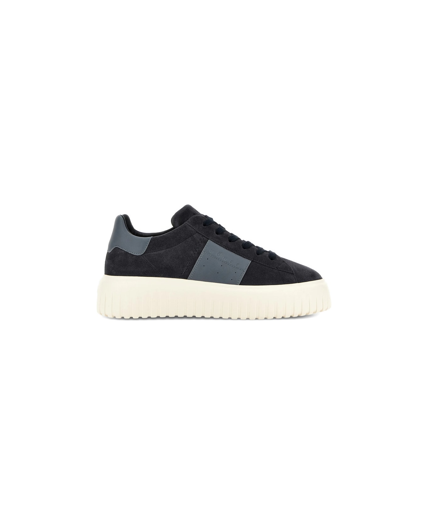 dark blue suede panelled platform sole lace-up fastening perforated detail