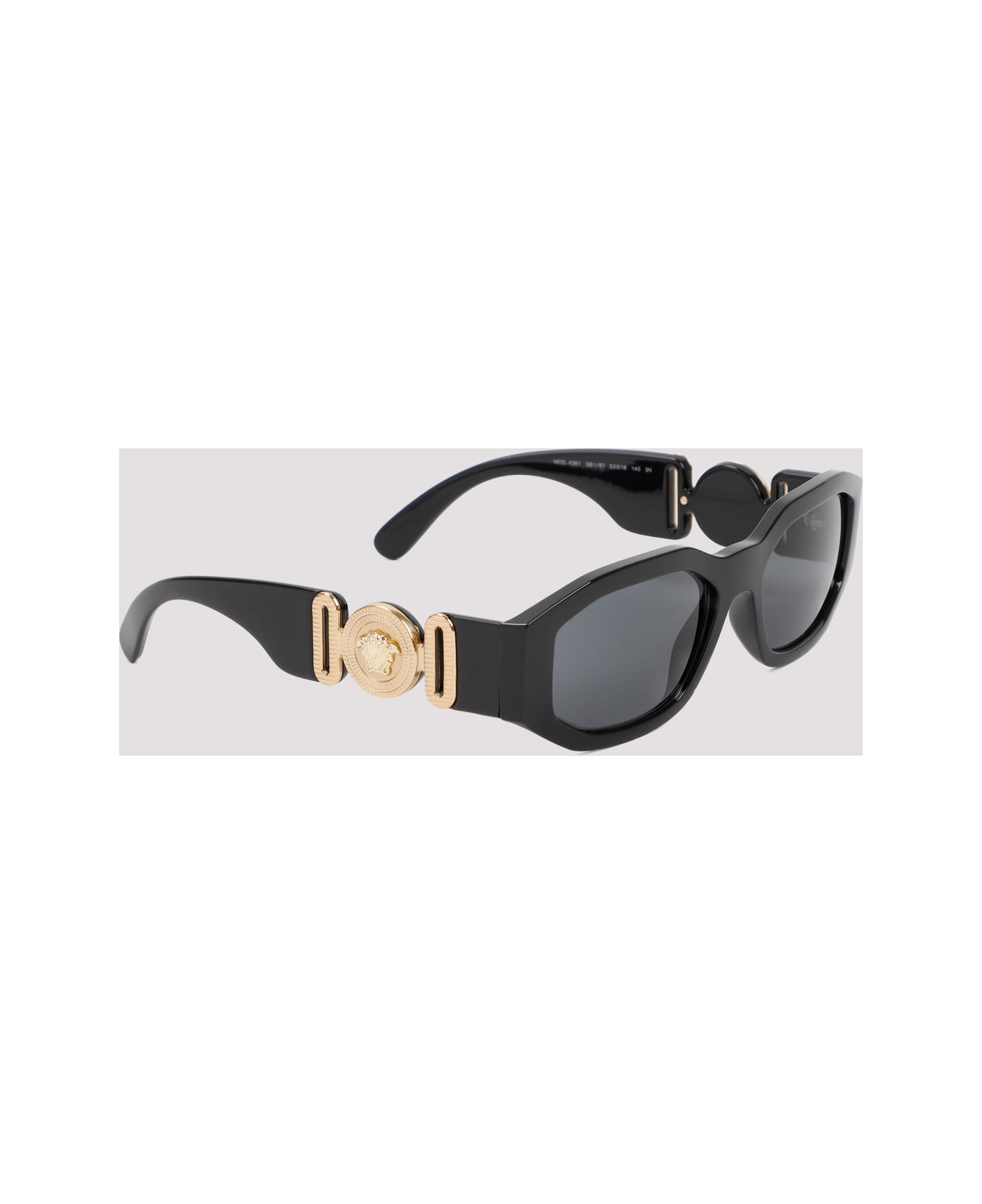 Versace Black Biggie Sunglasses. Black acetate, bold low-lens shape and wide temples embellished by a gold-tone heritage Medusa medallion. Gray lens color, silhouette inspired by the hip-hop culture.