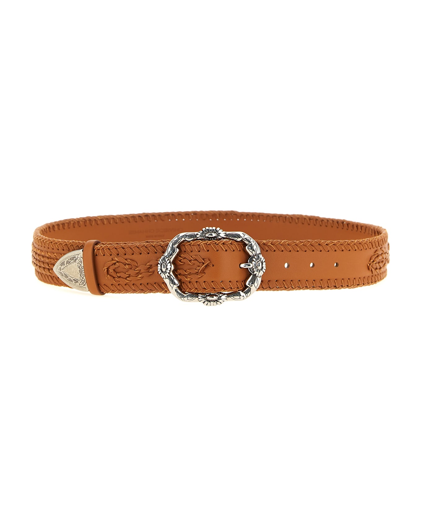 Smooth calf leather belt of the highest quality with 'Majaro' embroidery in tone-on-tone nappa leather tape, lasered toe cap and metal daisies buckle.