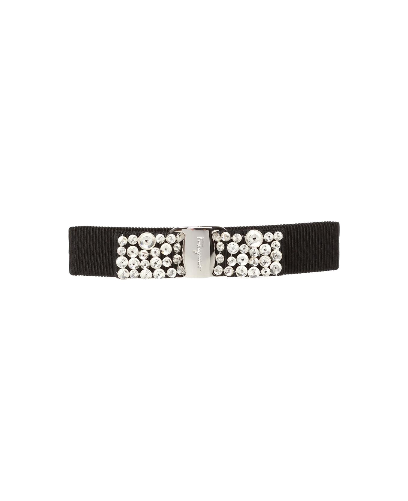Black and silver-tone hair clip from Salvatore Ferragamo embellished with a logo-embossed bow and white crystals. Composition: Cotton Rayon Brass