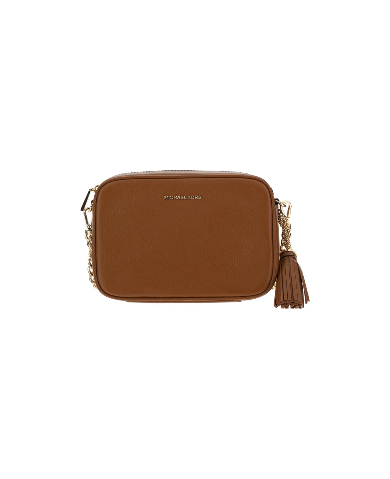Calfskin camera jet set bag by michael kors, top zip-around closure, gold-plated and removable chain shoulder strap, single interior compartment, iconic brand monogram printed in press-stamped and contrasting color on front, interior slit pocket, garnet leather design.