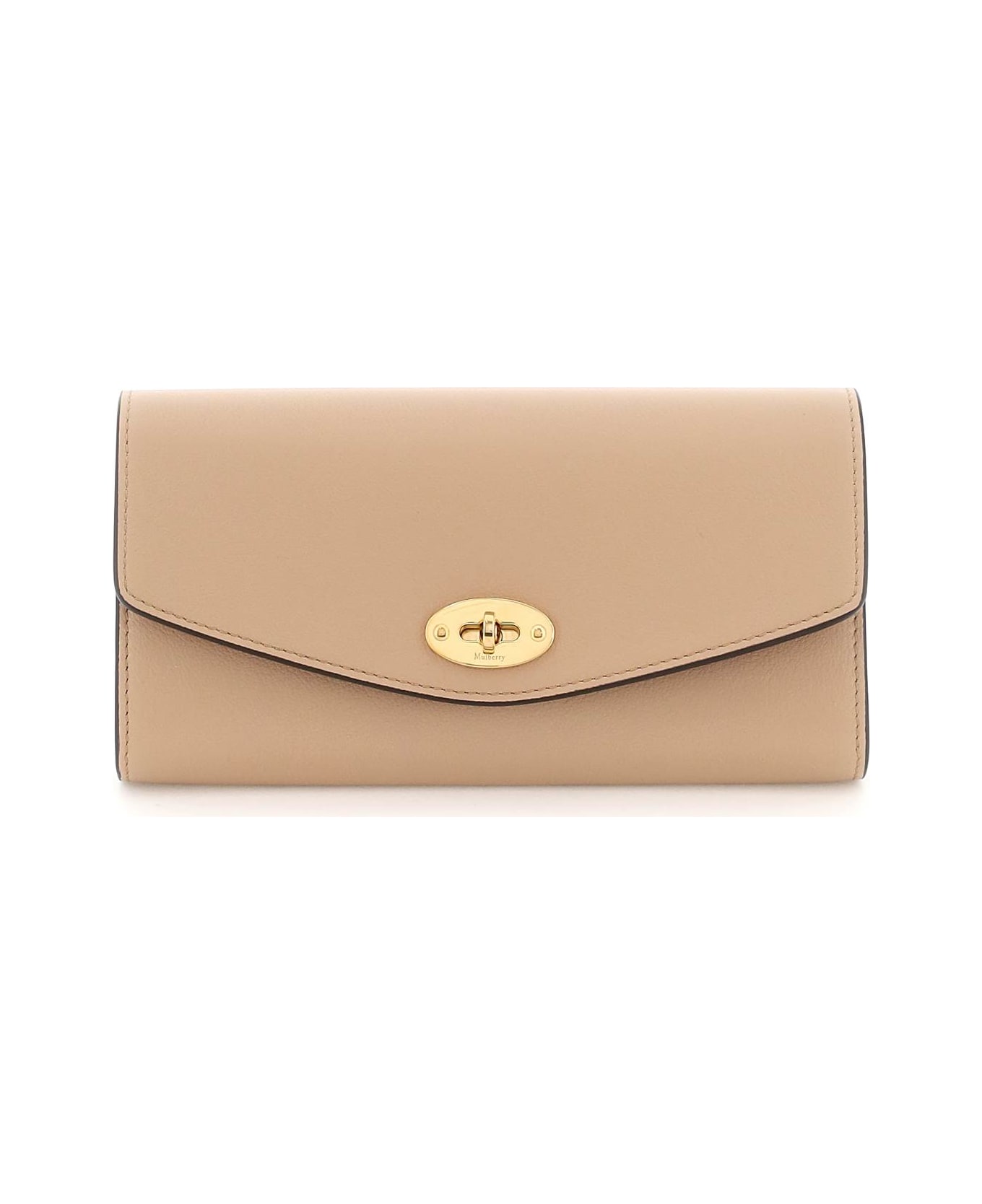 Darley wallet by Mulberry crafted in grain leather with flap featuring the iconic Postman's Lock closure. Leather interior composed of two gusseted compartments, a zipped flat pocket with moiré fabric lining, a front slit compartment, an open flat pocket and twelve credit card slots. One credit card slot on the back. Gold-finished metalware.
