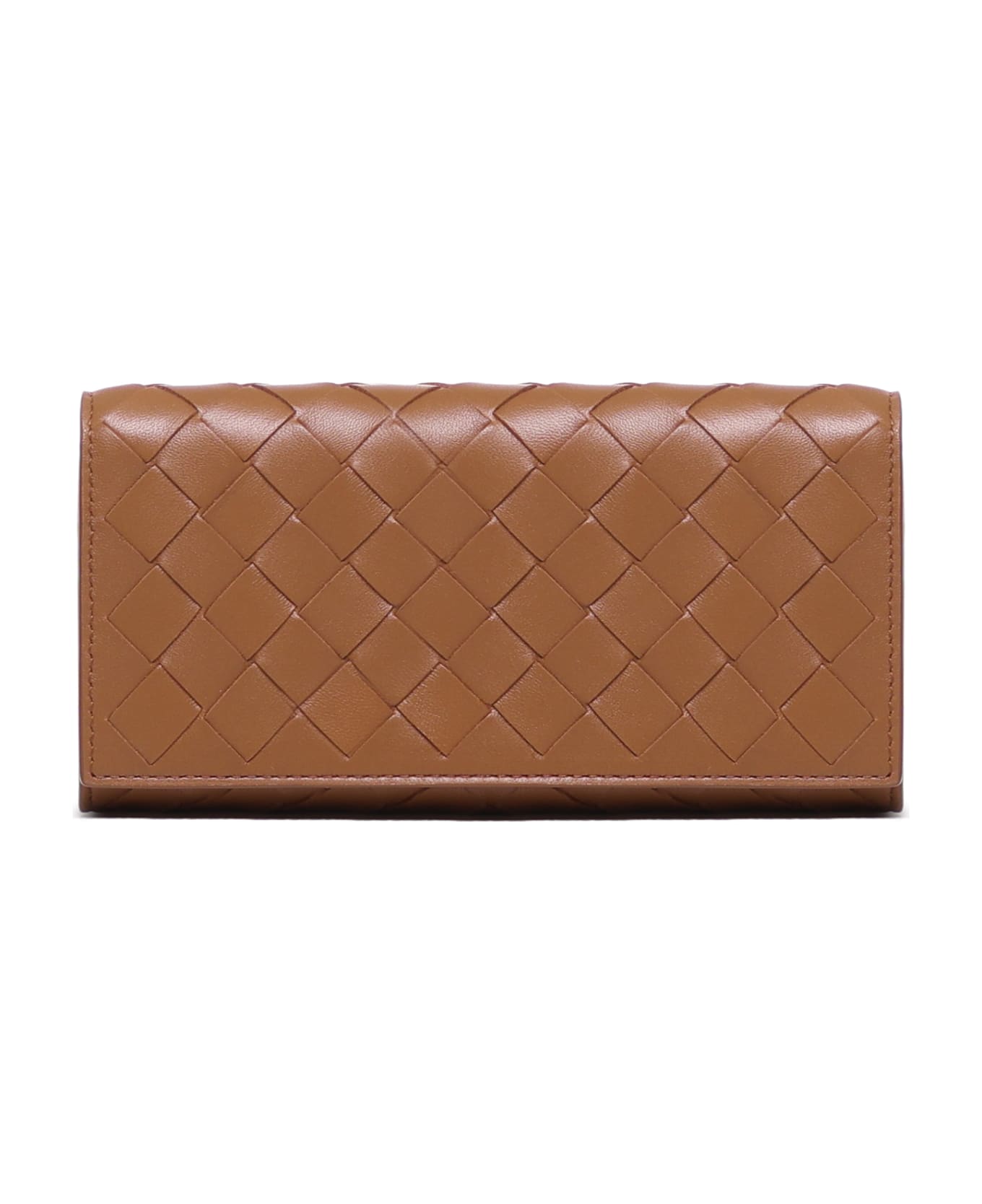 Wood-gold Large Intrecciato Wallet With Flap from Bottega Veneta -Leather wallet with Intrecciato motif -Twelve card slots, two compartments for banknotes, one further pocket, one coin purse with zip -Snap button closure -Metal accessories: gold finish -Measurements: 10x19x3 cm -Made in Italy -Colour : Wood -100% Lambskin