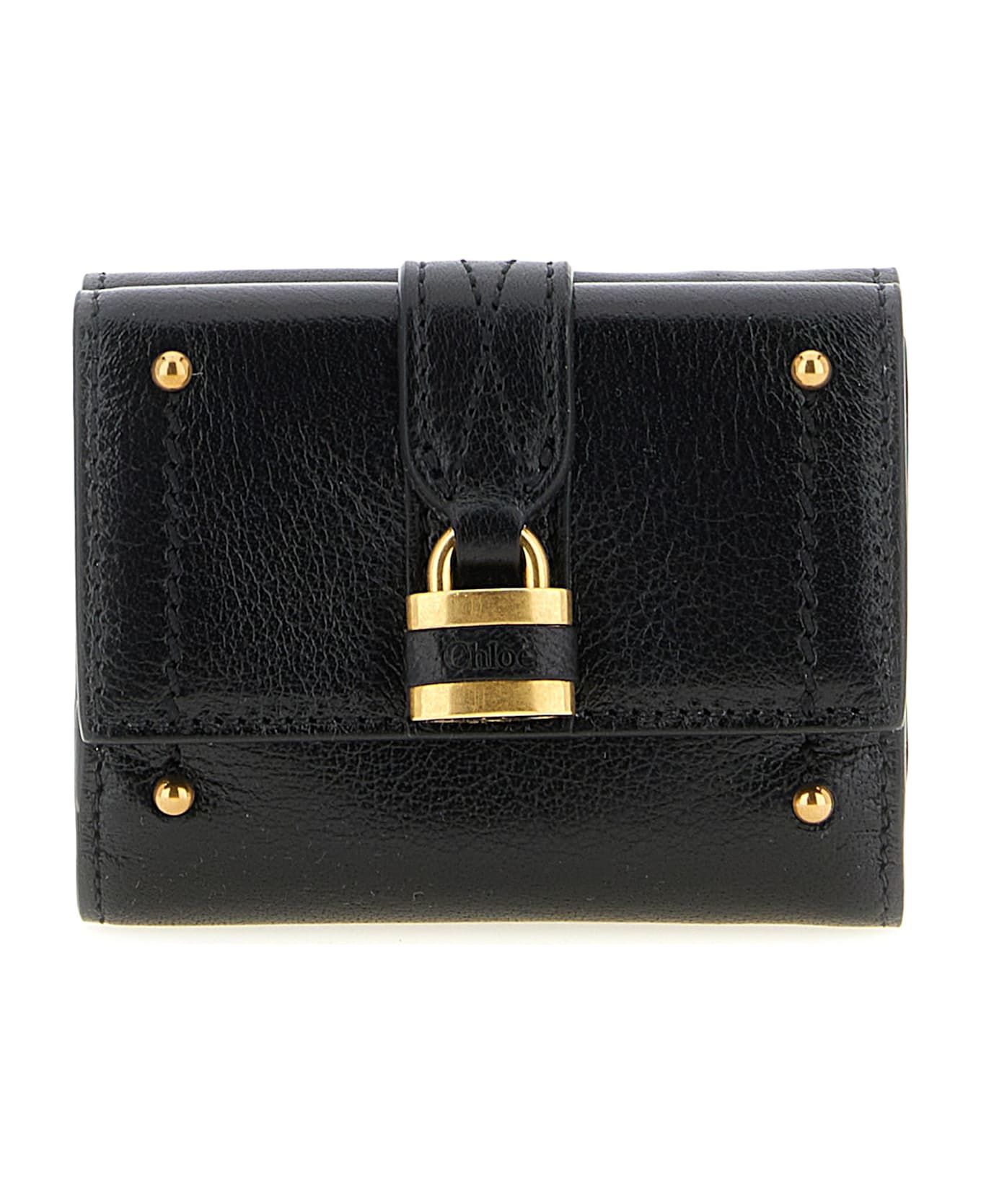 'Paddington' mini wallet in grenade buffalo leather, trifold model, flap closure with snap button on both sides, Gold padlock and front metal studs. SUSTAINABLE: To make this product, Chloé worked with tanneries with Leather Working Group (LWG) certification, which is based on water and energy consumption and chemical, solid waste and slurry management policy.