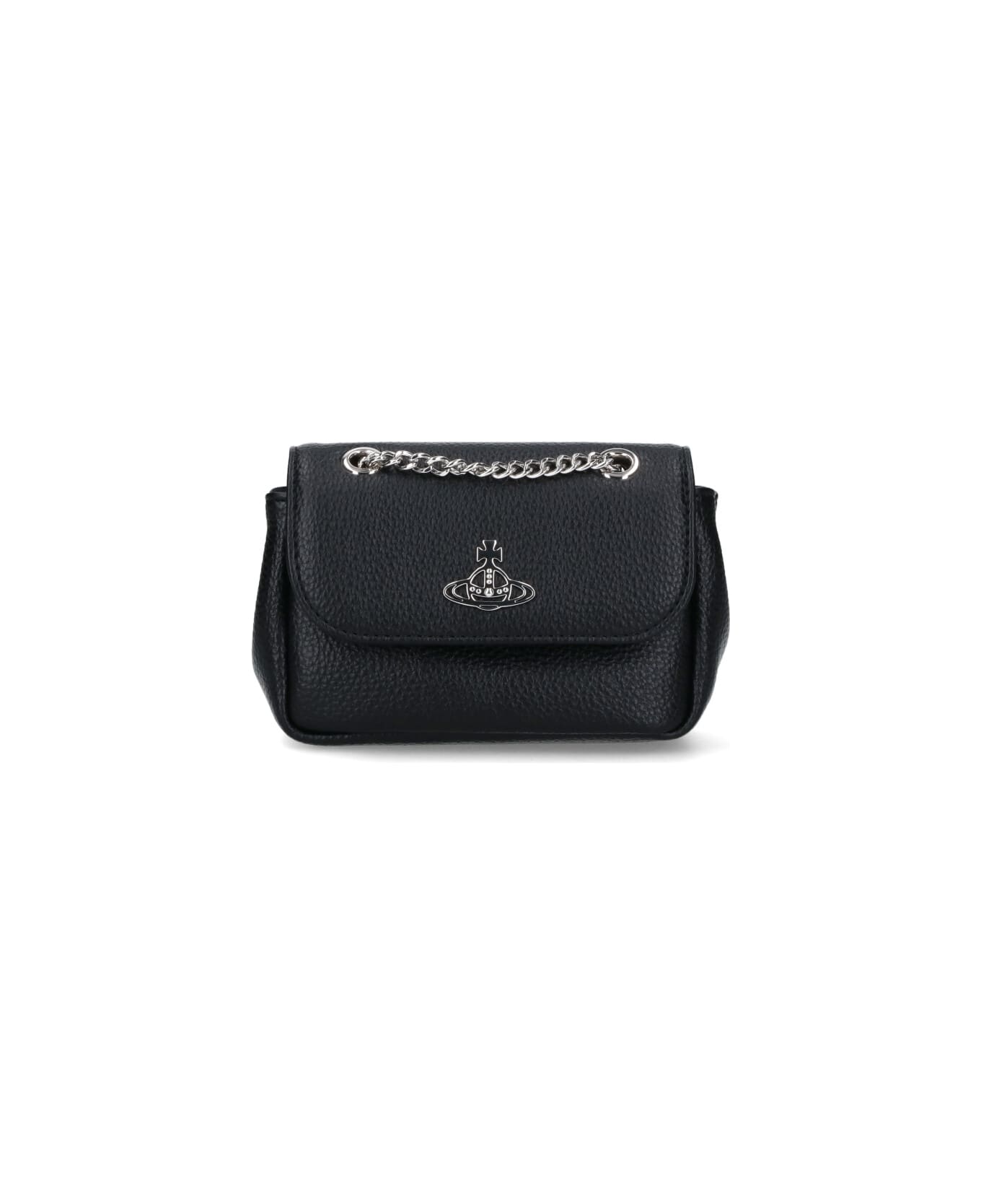 Vivienne Westwood small handbag in black hammered faux leather with silver metal chain sliding shoulder strap, magnetic button flap closure, silver metal "Orb" logo detail, one single inner compartment. Composition: 100% Polyurethane
