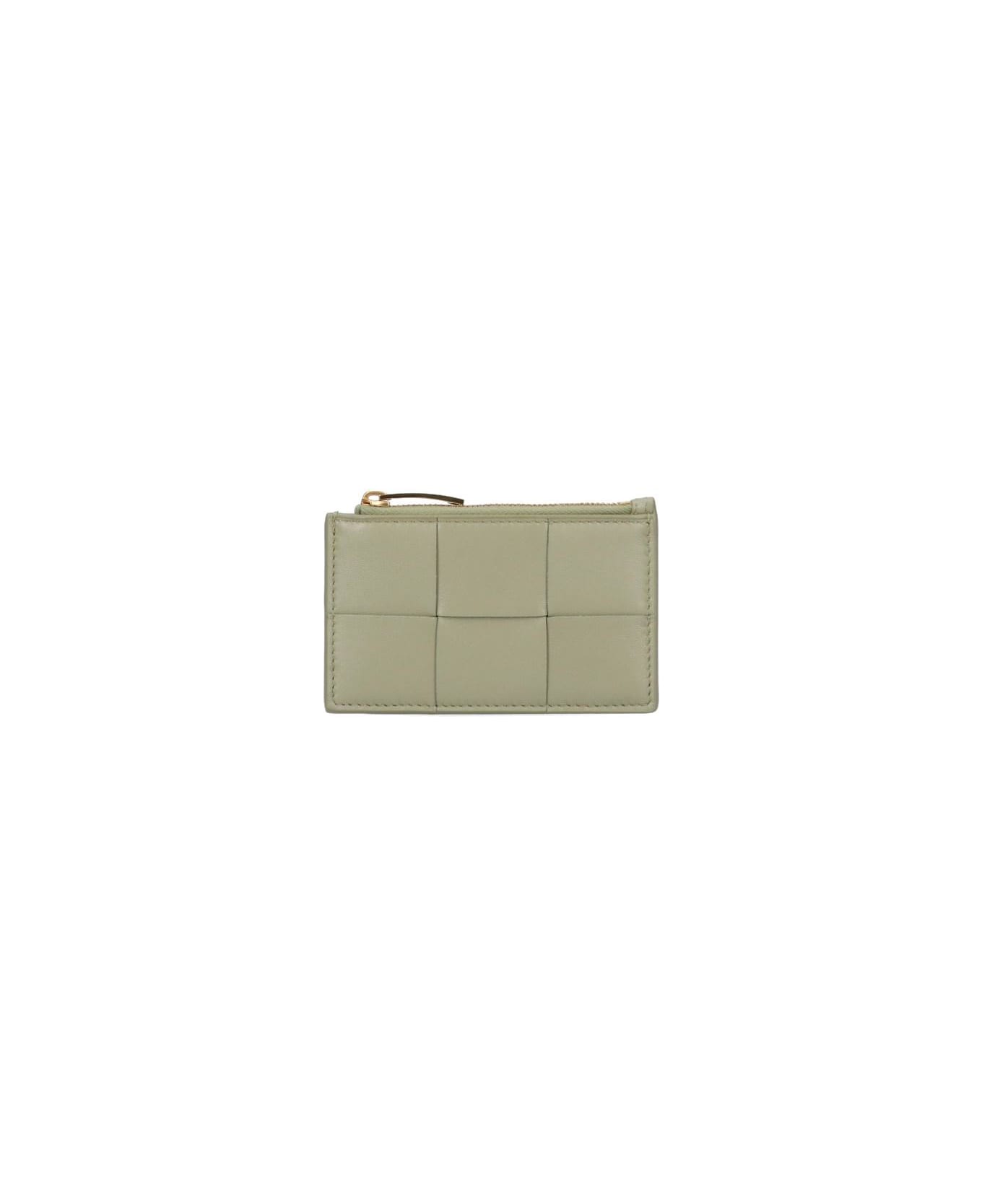 Bottega Veneta 'Intrecciato' aqua taupe leather card holder with top zip pocket, three card slots at the back, engraved logo detail at the back.