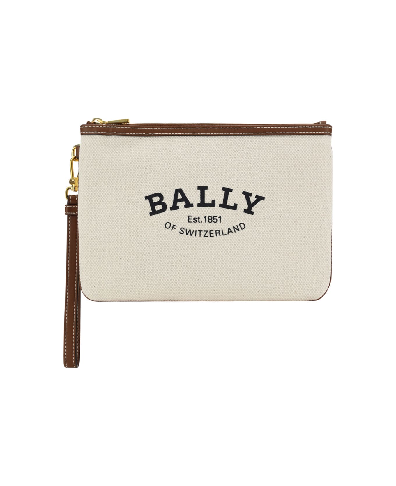 Cotton certhe pouch by bally, gold-tone logoed zip top closure, a removable leather puller to carry it by hand, a single internal compartment, and a contrasting iconic brand monogram on the front.