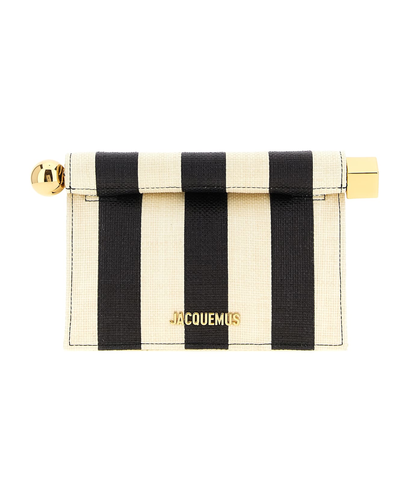 'La Petite Pochette Rond Carré' striped raffia patchwork clutch bag with lambskin details, front metal lettering logo, folded magnetic closure, side metal ball and cube detail, cotton lining.