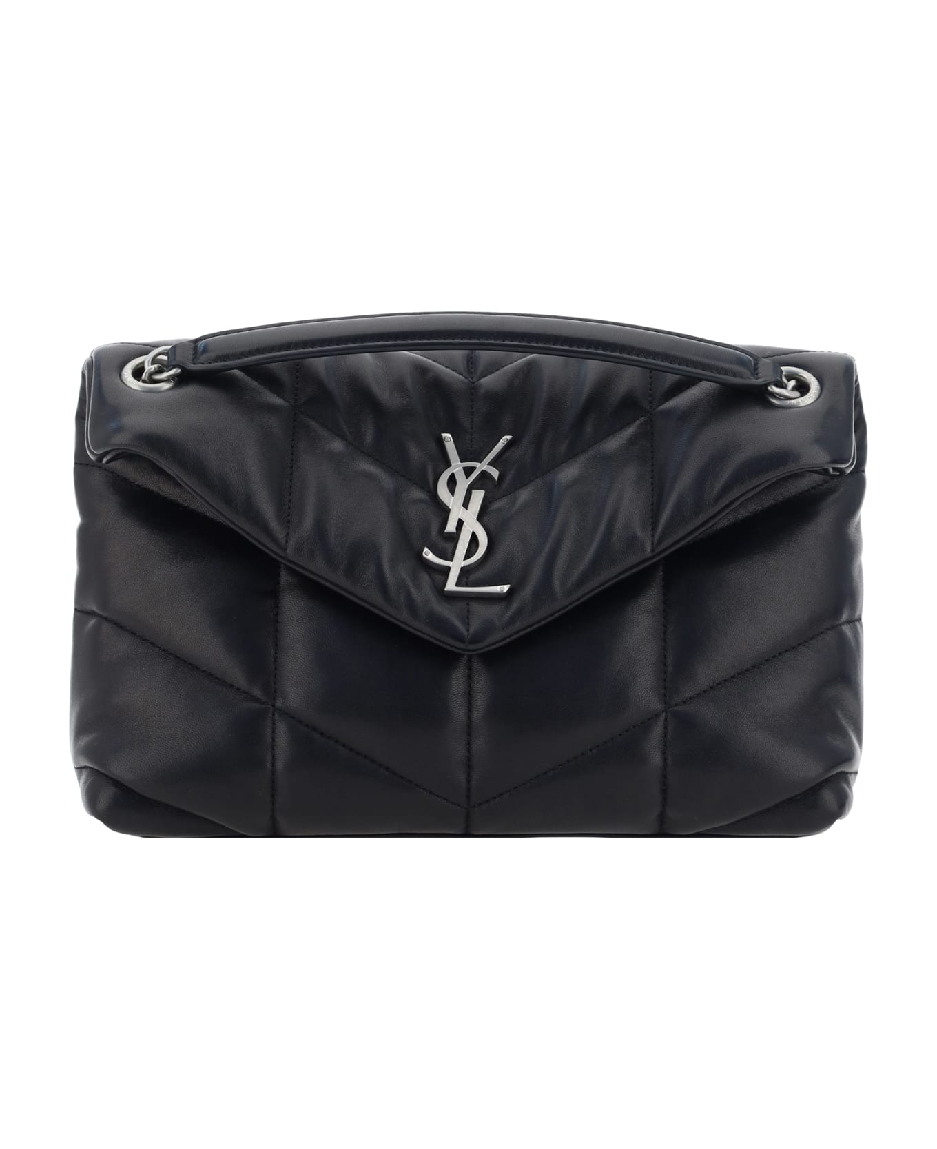 Lambskin loulou shoulder bag by saint laurent, front magnetic button closure, all-over padded and quilted design, sliding chain strap with leather inserts, embossed iconic ysl logo plaque on front, single interior compartment, interior slit pocket.