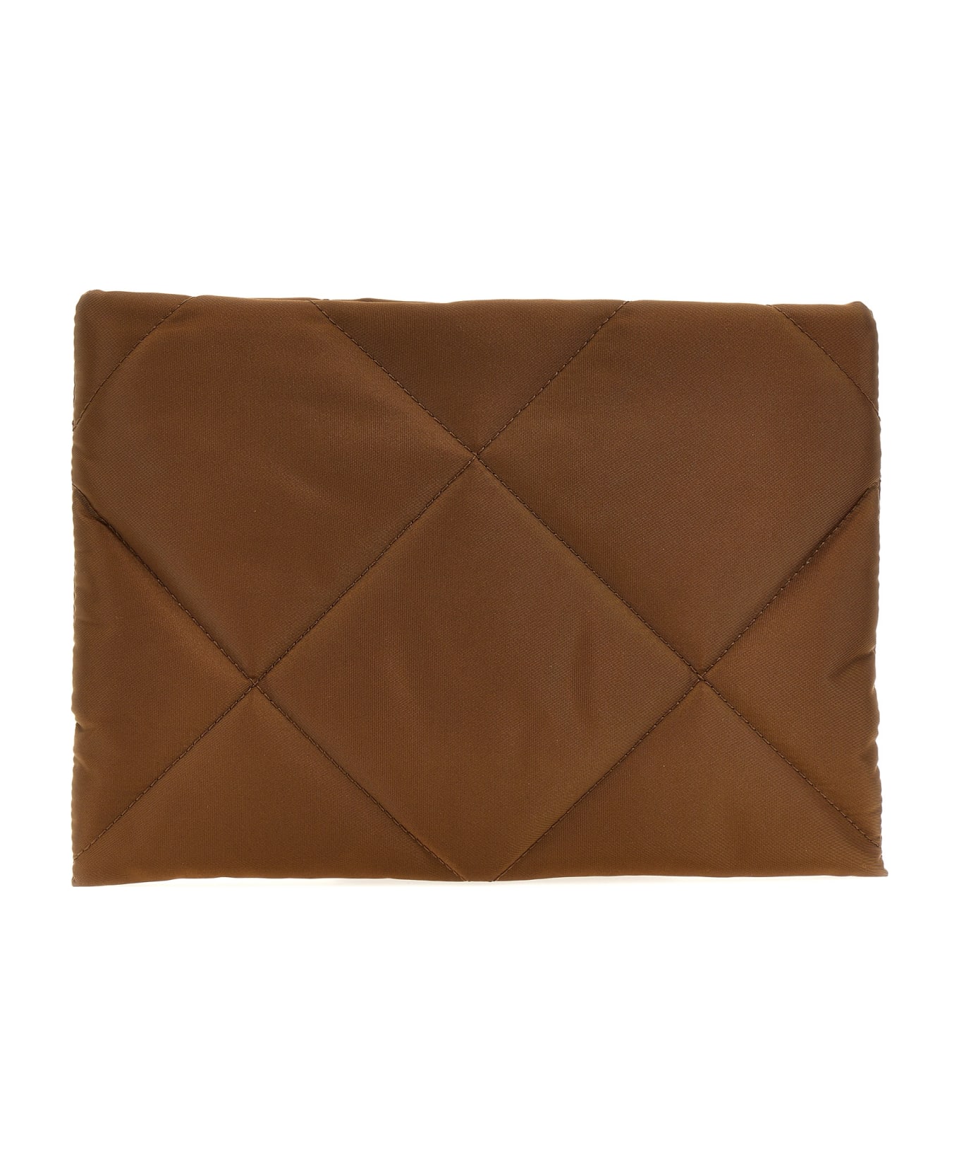 Quilted nylon clutch bag, magnetic closure, chain and leather shoulder strap.