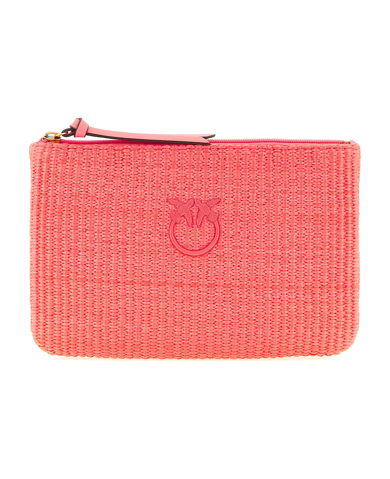 Braided raffia-effect fabric clutch bag, front tonal 'Love Birds' embroidery, top zip closure, cotton drill lining, and inner pocket. Handcrafted product, any imperfections are to be considered characteristics of uniqueness.