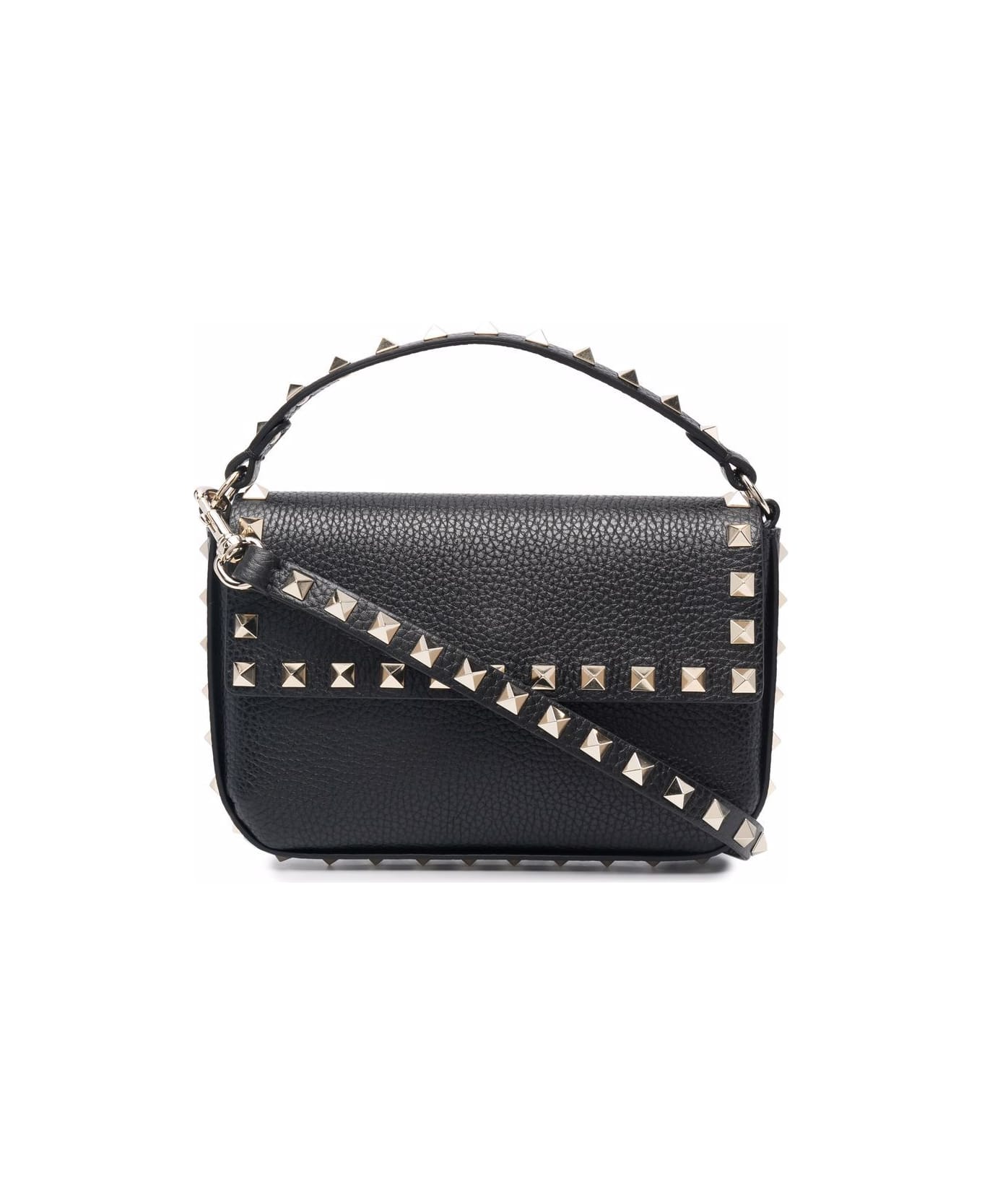 Valentino Garavani Rockstud black magnetic button fastening gold-tone Rockstud embellishment platinum-finish metal studs and hardware logo print to the rear single flat top handle foldover top open slip pocket three card slots adjustable detachable shoulder strap The full look includes Valentino Garavani accessories. Composition: Calf Leather, 100%