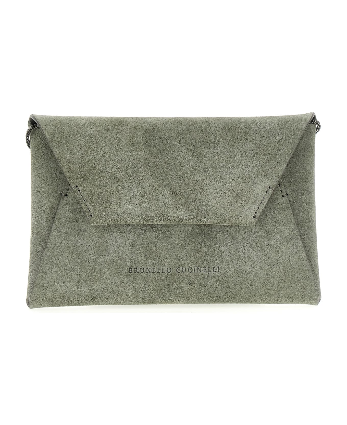 Suede crossbody bag with front logo print, a magnetic closure and a chain shoulder strap.