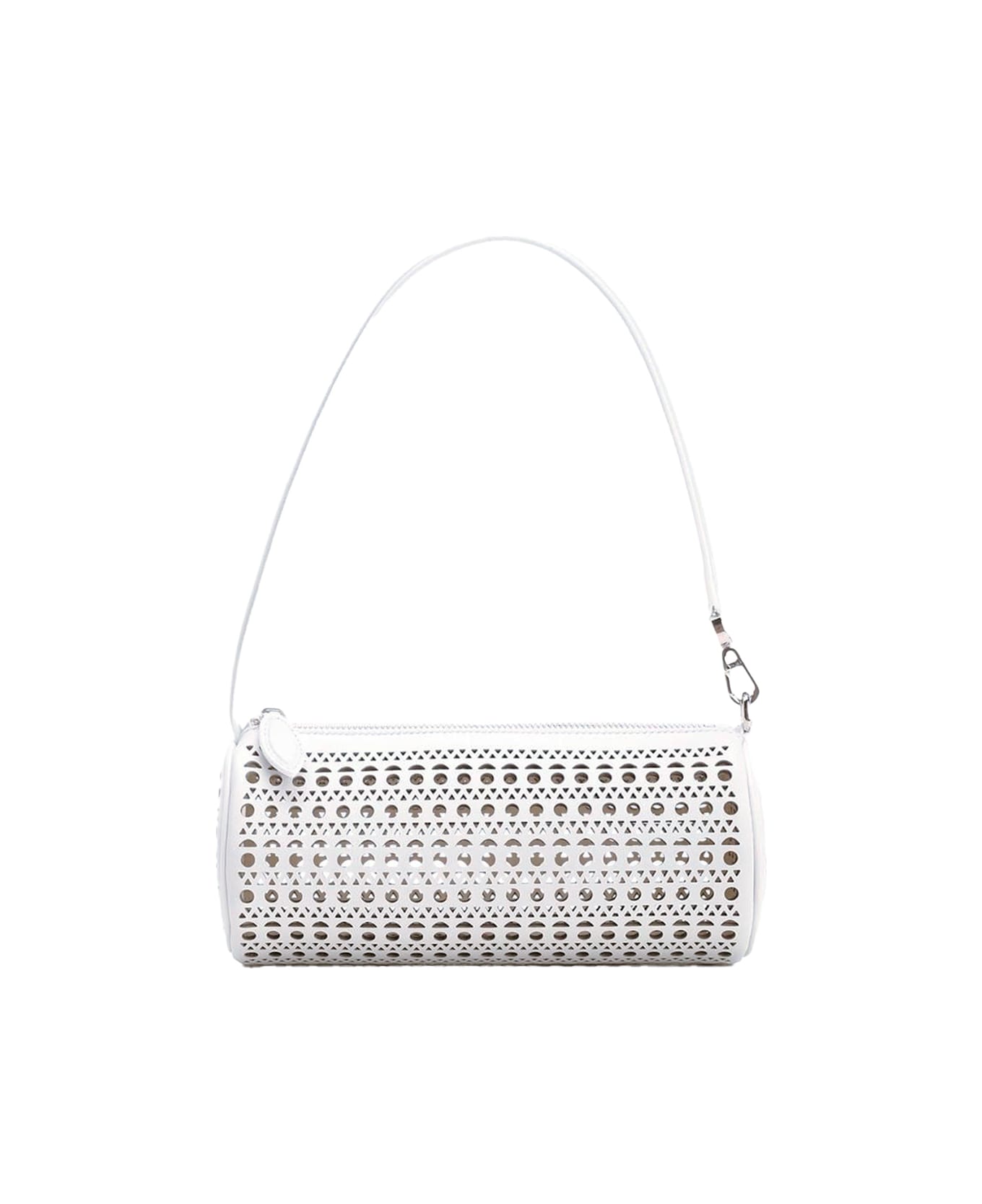 Small tubular shoulder bag by Alaia in white leather with Vienne motif inspired by precious lace and the architectural fretwork of the Mashrabiyya. Versatile model: can be attached to another bag thanks to the hook. Zip closure.