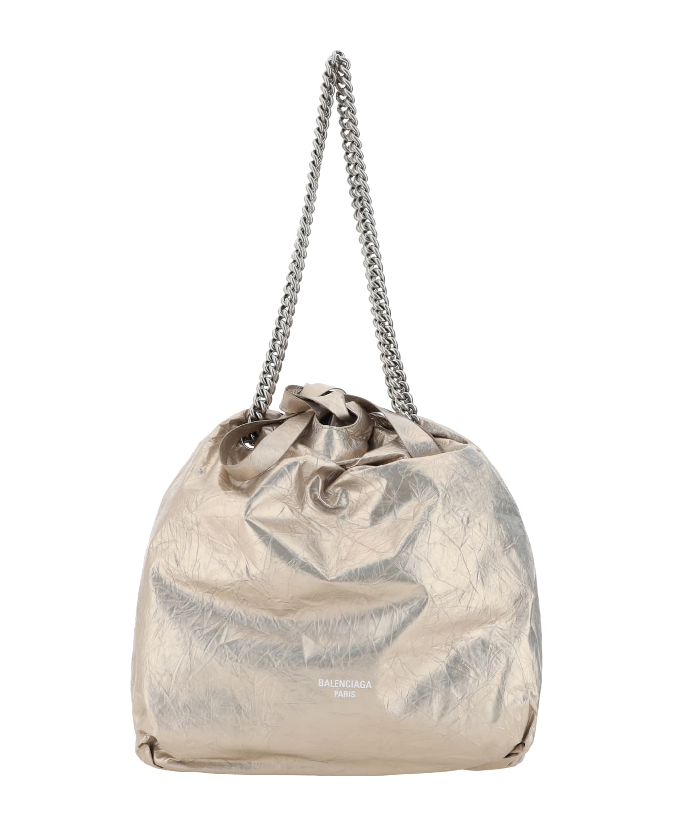 Calfskin crush tote bucket bag by balenciaga, crinkled leather design, chain top handles, drawstring closure at top, single interior compartment, contrasting iconic brand monogram at front.