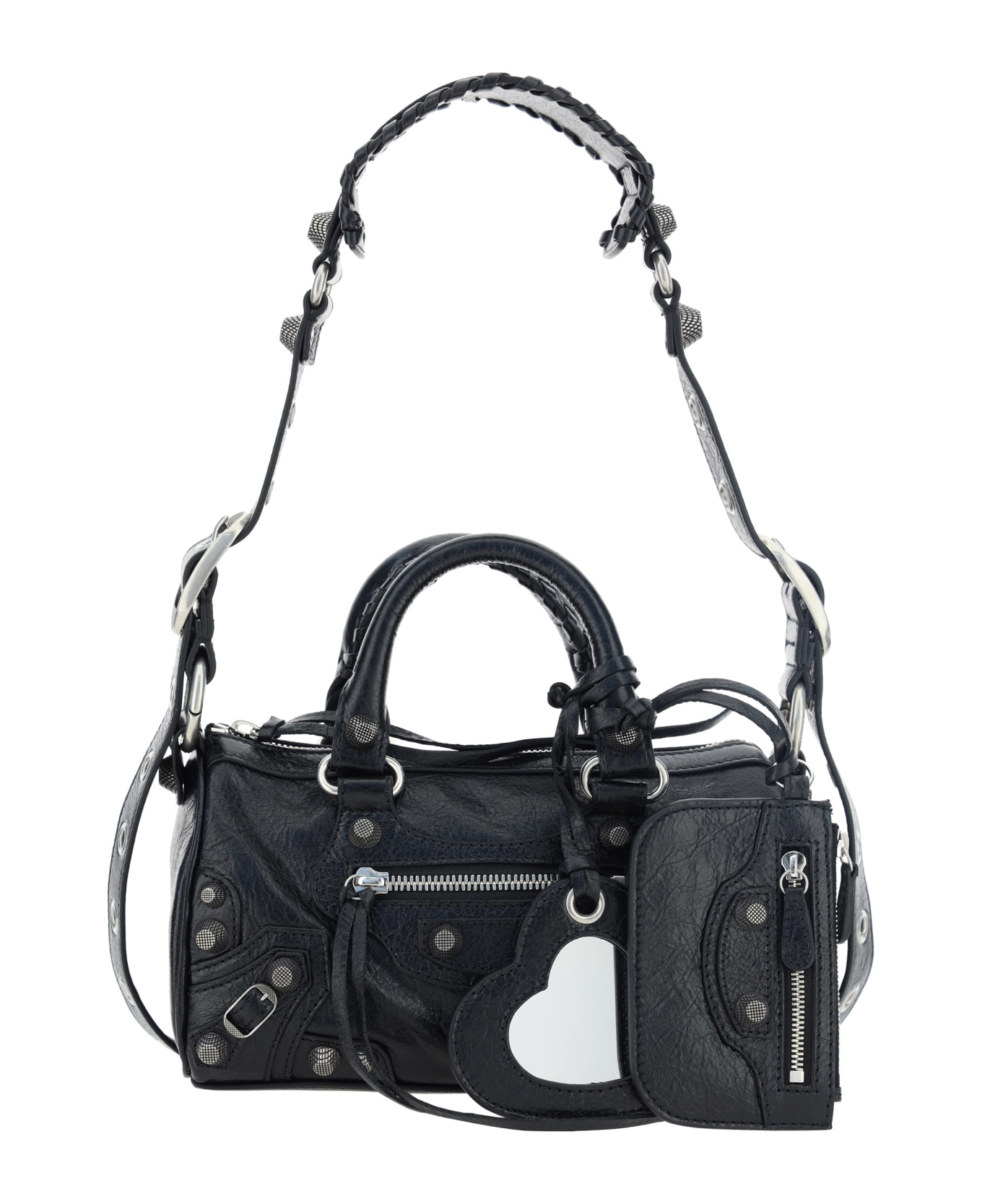 Lambskin le cagole mini shoulder bag by balenciaga, worn-effect grained leather design, adjustable and removable shoulder strap, double stiff top handles, all-over silver-tone details and studs, top zipper closure, slit pocket on front with zipper for closure, heart-shaped mirror detail applied on front.