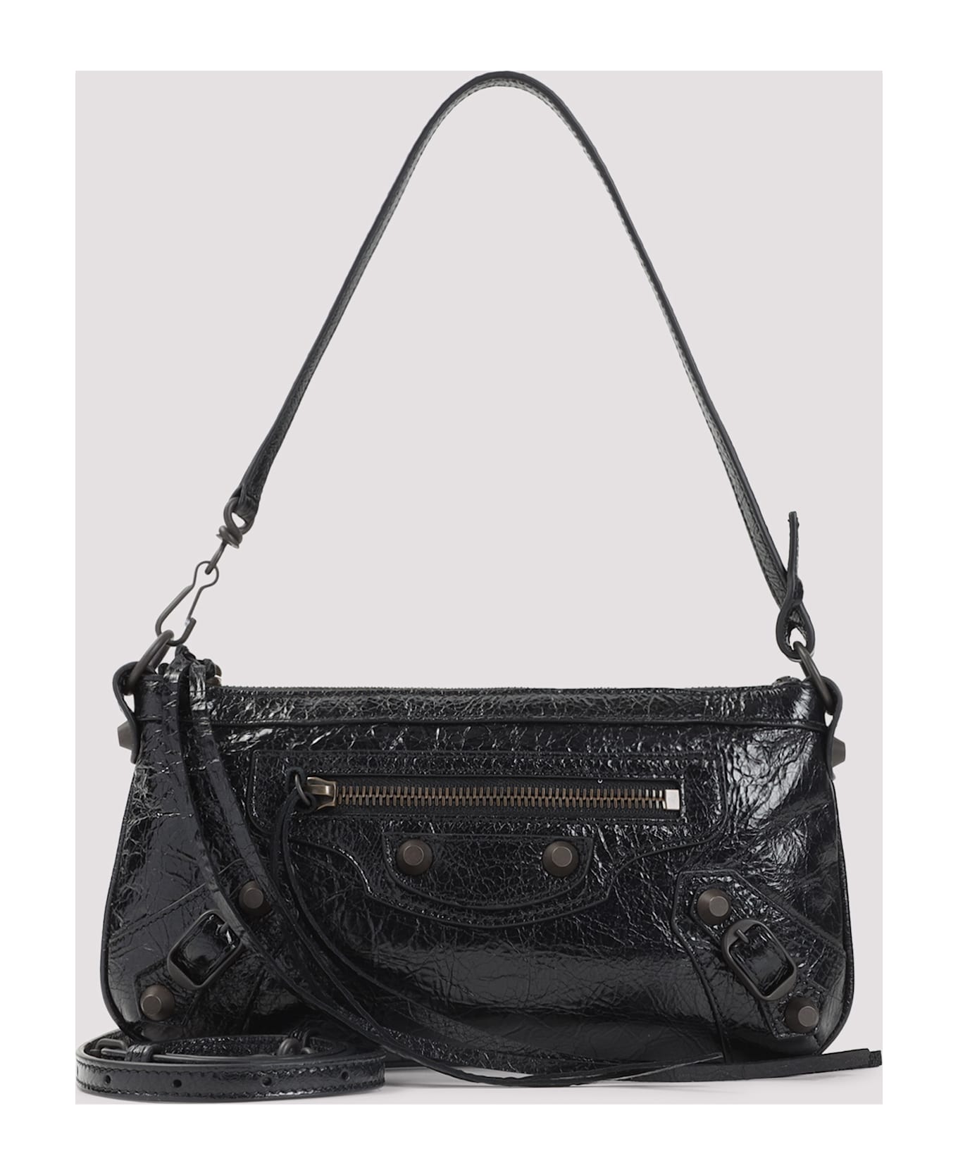 Balenciaga Black Leather Le City Pouch Bag. Pure black leather bag, top detachable handle, top zipped fastening, top zipped fastening, front zipped pocket, front tonal studded details, side tonal leather straps with tonal buckle, adjustable and detachable shoulder strap, one main compartment. Black hardware.