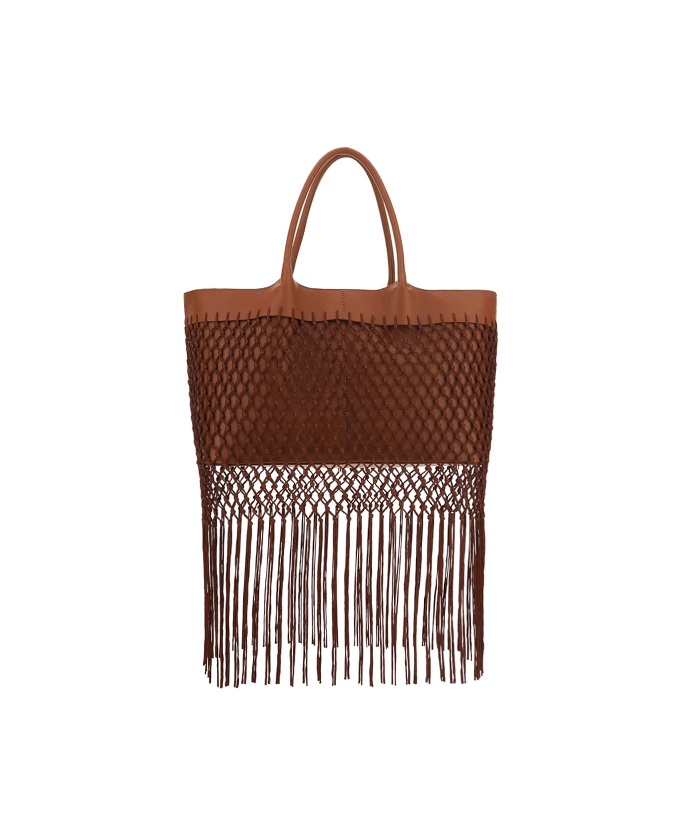 Calfskin mcewan fringe tote bag by gabriela hearst, two stiff leather handles, metal support feet at base of bag, magnetic strap closure, interior with multiple pockets, soft nappa leather lined bag with all-over fringing.
