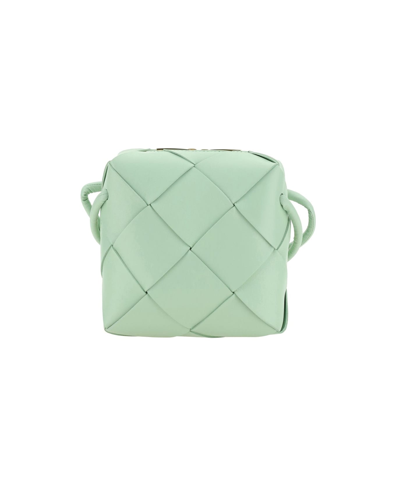 Composition: 100% Lamb Leather Top zip closure Intrecciato weave 15 x 15 x 7 cm Double tubular shoulder strap Made in Italy