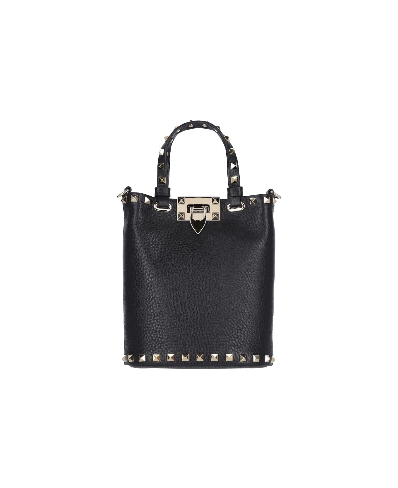 Valentino Garavani "Rockstud" crossbody pouch bag in black hammered leather with all-over gold metal studs, two handles, adjustable and removable shoulder strap, hook closure, gold embossed logo on the back, three internal card slots, one main inner compartment. Composition: 100% Calf Leather