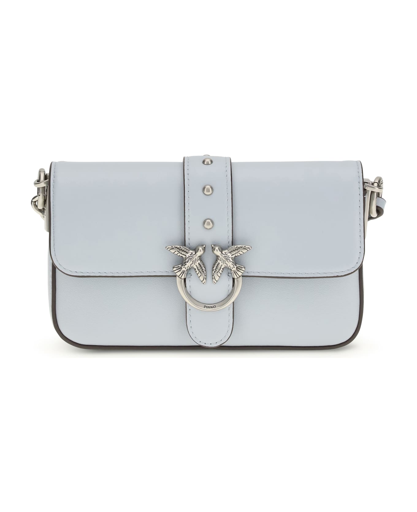 The baby love shoulder bag by pinko is an iconic and versatile accessory featuring an adjustable leather shoulder strap with buckle and a chain strap with leather shoulder strap to suit different style needs. the flap closure is embellished with the pod and buckle featuring the iconic love birds diamond cut logo in antique gold plated metal, giving it a distinctive and elegant touch.