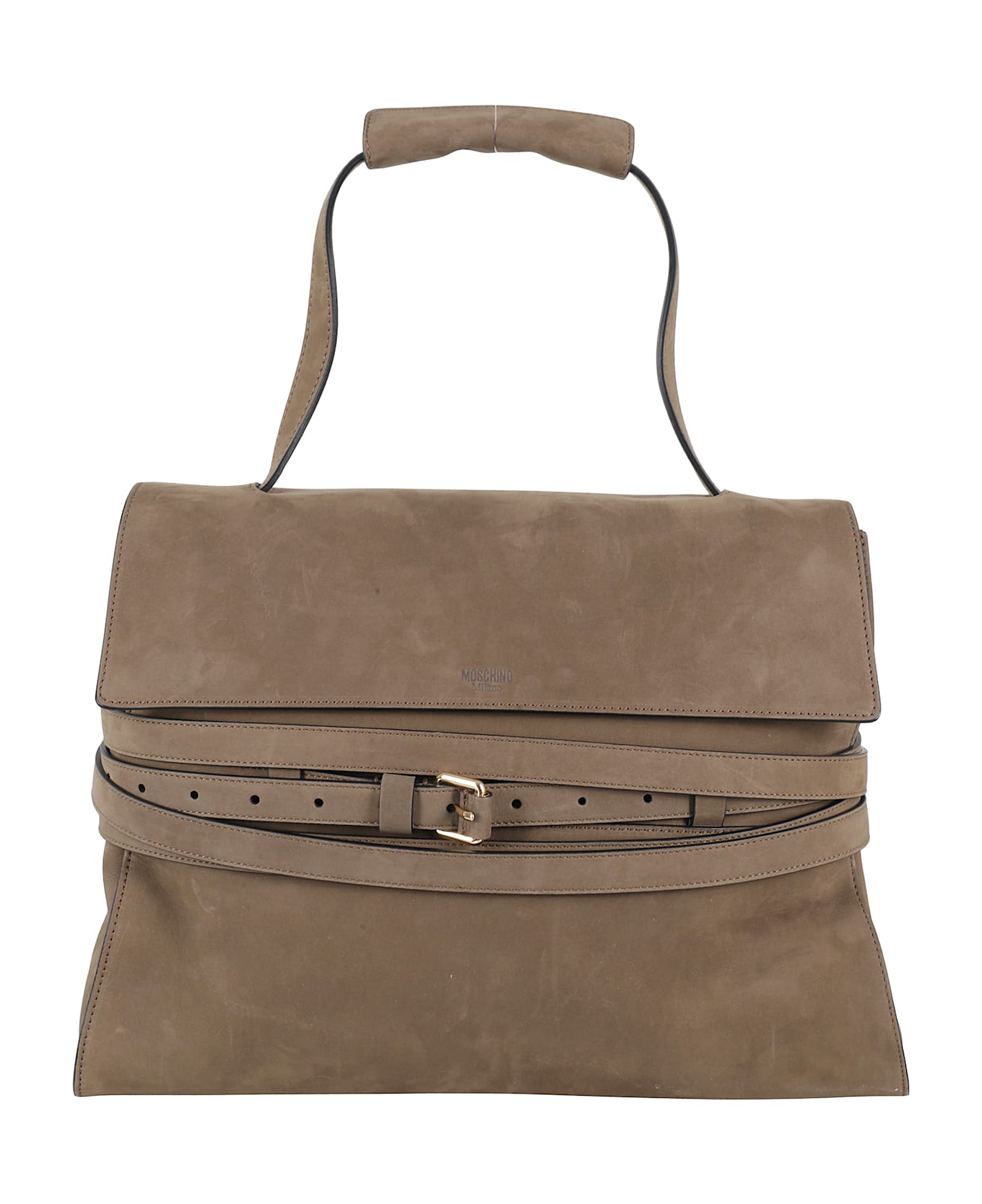 Moschino forest-colored Nubuck bag Single compartment intenro Flap closure and magnetic buttons Single handle Suede adjustable and removable shoulder strap Belt Dimensions: Width 38cm x Height 31cm x Depth 15cm