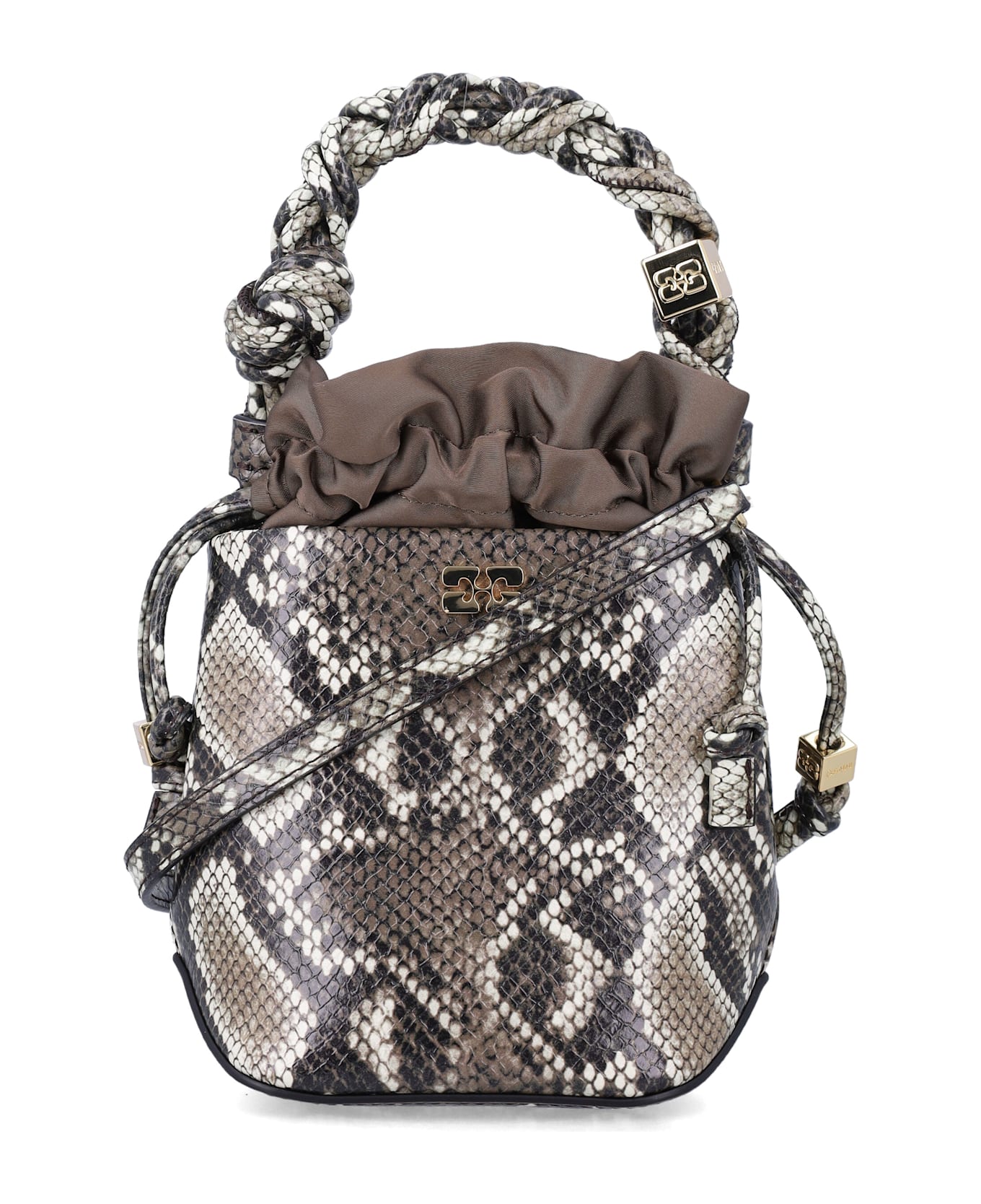 The Bou Bucket Bag Reimagines Ganni s Playful Codes With A Snakeskin-embossed Finish And A Sculptural Braided Handle. Its Structured Silhouette Holds A Soft Drawstring Pouch Inside, Balancing Texture And Functionality For An Elevated Everyday Accessory With Refined Gold-tone Accents. Snakeskin-embossed Exterior