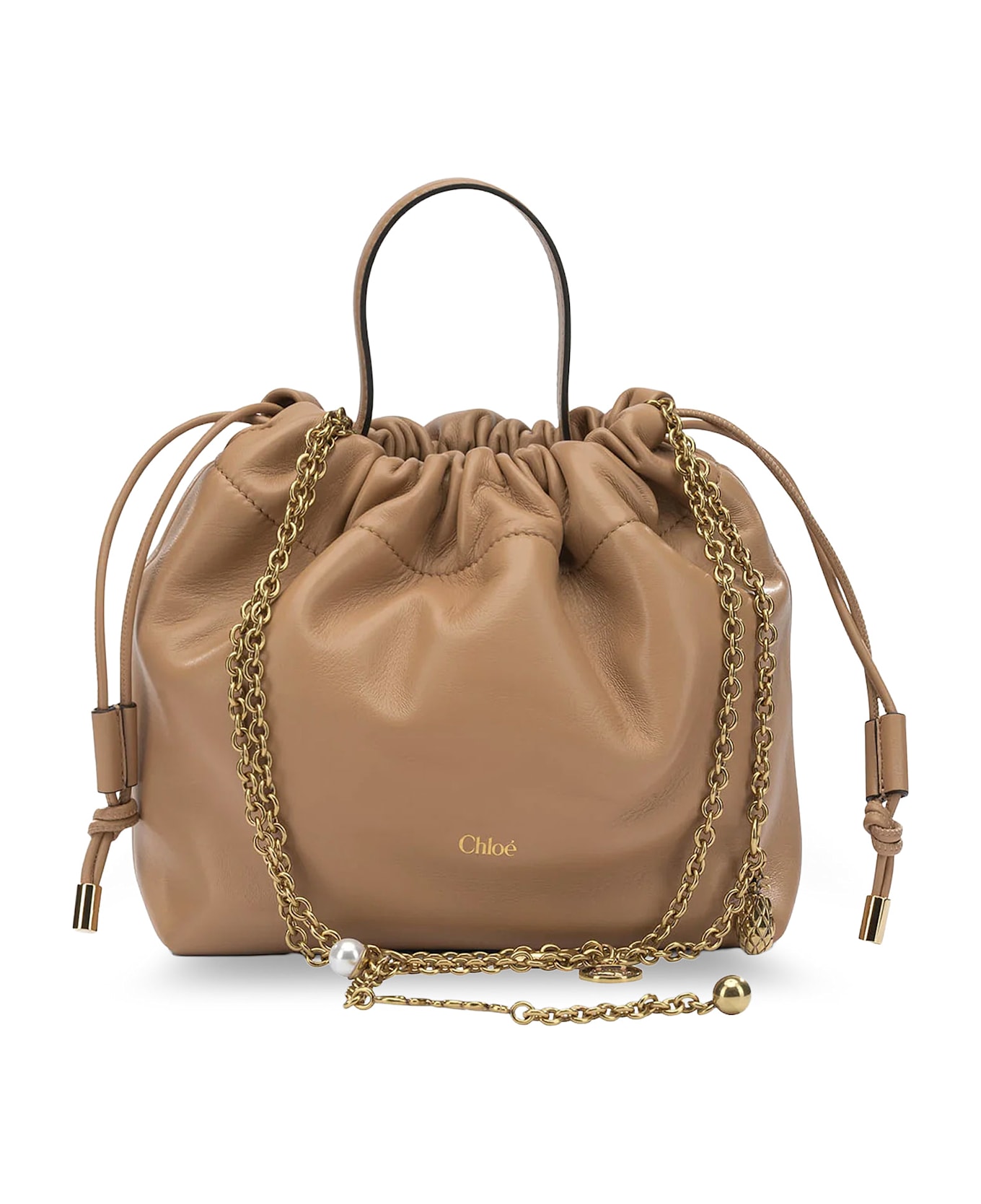 Leather handle Metal shoulder strap with lettering logo Adjustable drawstring closure Made in Italy Leather W: 17 cm, H: 16 cm, D: 8 cm SKU: CH26UP789R1226X