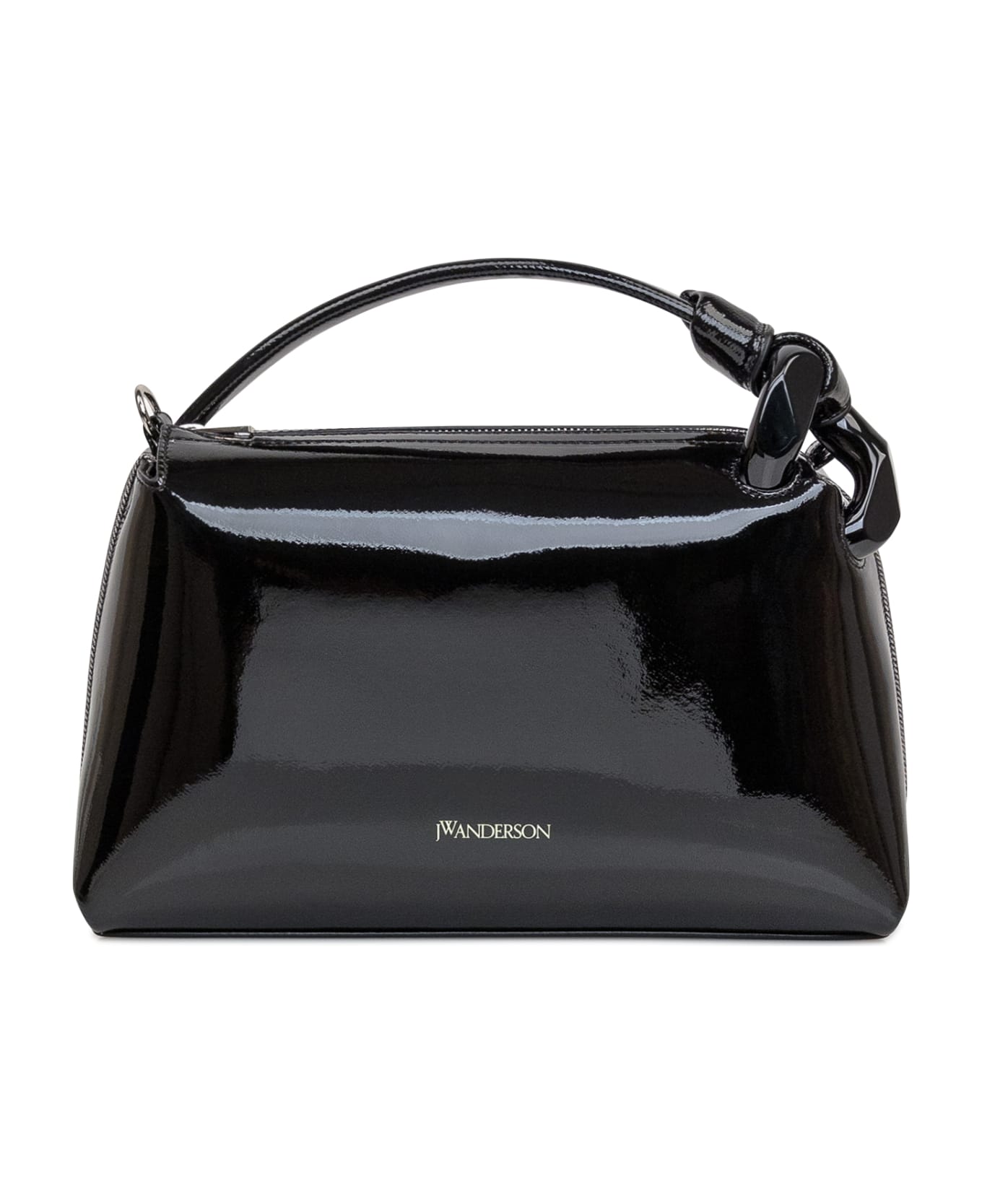 Black shiny leather bag. Black ring detail. Removable shoulder strap in leather. JW Anderson logo printed on the front. Zip closure and logo strap. Leather inside pocket.