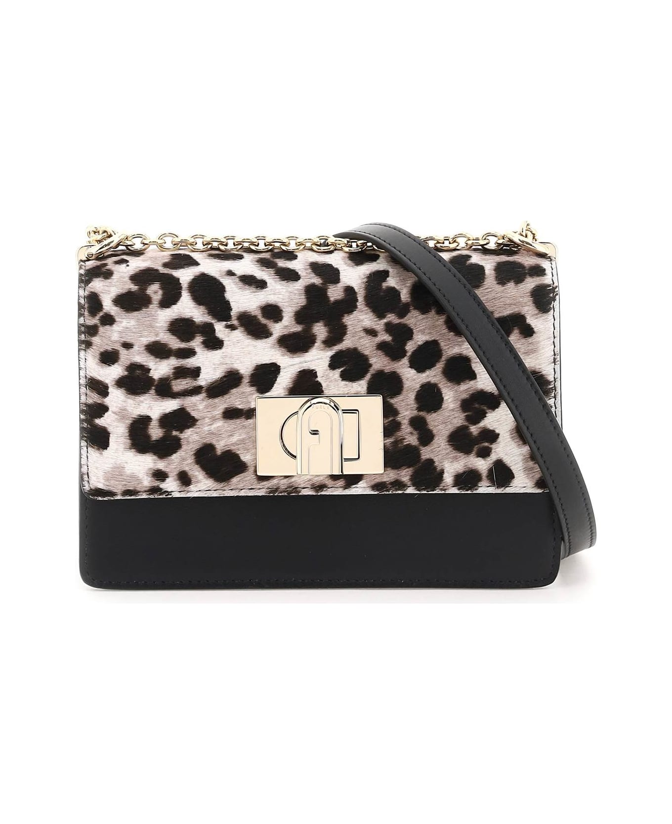 Furla 1927 mini bag in grain leather featured by a structured line with sliding double handle chain with leather insert. Animalier ponyskin flap with metal twist lock logo closure, rear flat compartment, fabric-lined interior with one flat pocket. Gold-finished metalware.