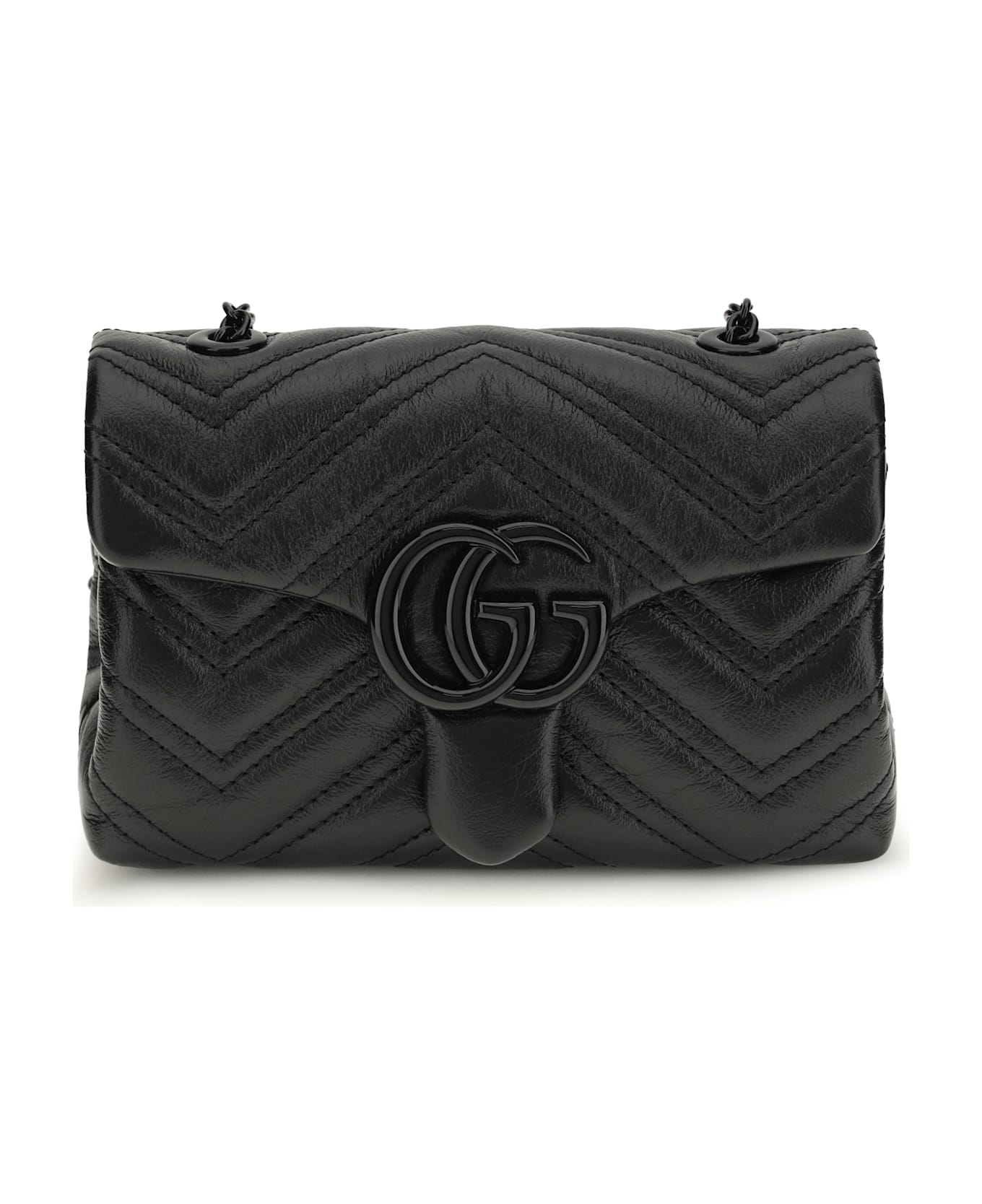 The gg marmont mini shoulder bag by gucci, crafted from matelassé nappa leather with a chevron pattern, combines elegance and refinement. embellished with tone-on-tone enamel hardware and the double g logo, it features a leather shoulder strap with chain and black ottoman lining. the magnetic snap closure completes the design, making the bag versatile and sophisticated.