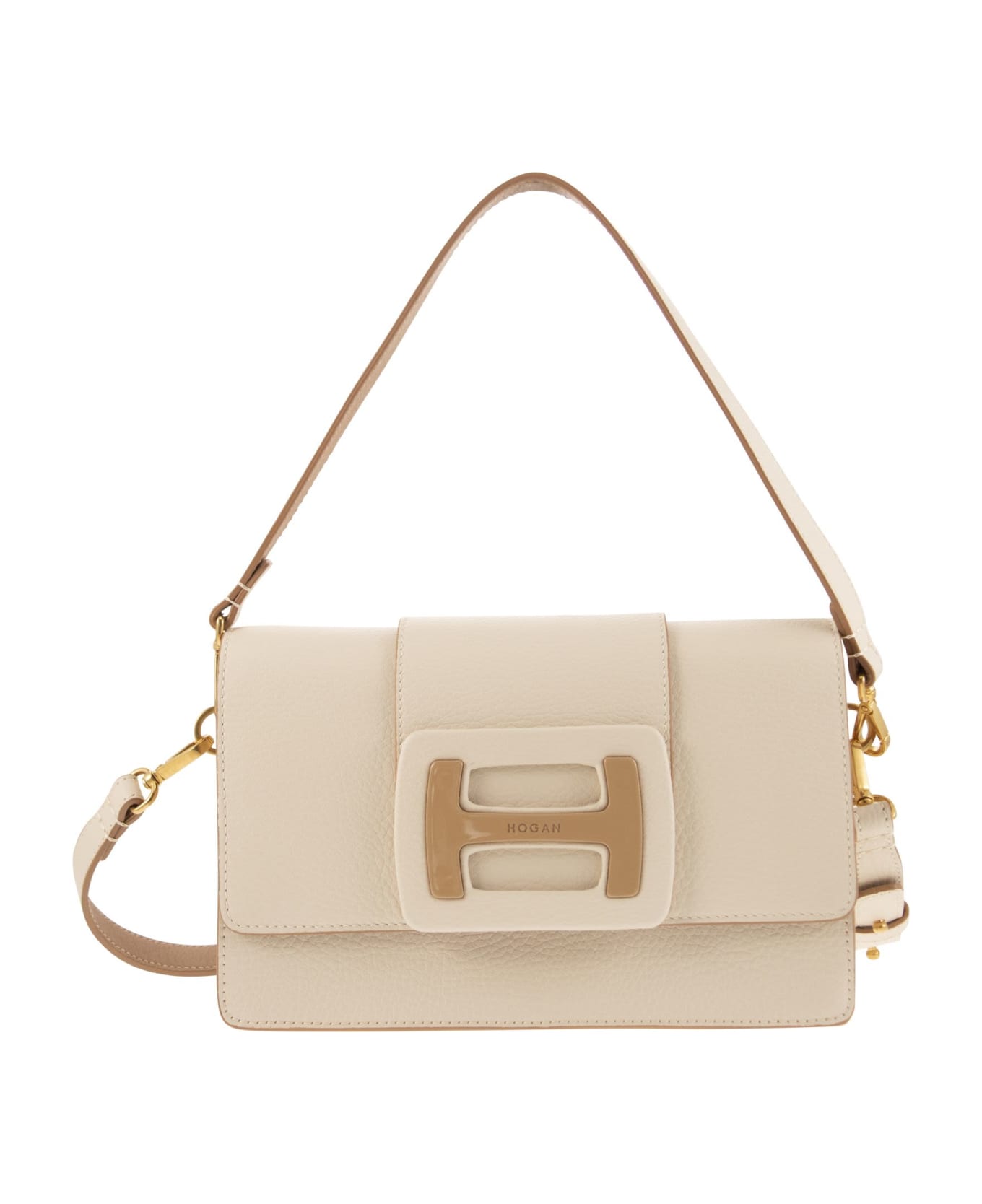 Cool and feminine, the Hogan H-Bag collection represents a contemporary synthesis of functionality and elegance. Featuring a maxi H-buckle, this flap bag is crafted in hammered-effect leather. Closed with a flap and magnetic button, it features an interchangeable handle and shoulder strap for versatile use, even as a clutch bag. The interior has two practical gusseted compartments. - Hogan logo buckle - Flap and magnetic button closure - Interior with two compartments - Inside pocket - Removable handle, adjustable and removable shoulder strap DESIGNER ID: KBW01MN3102R8T7C07