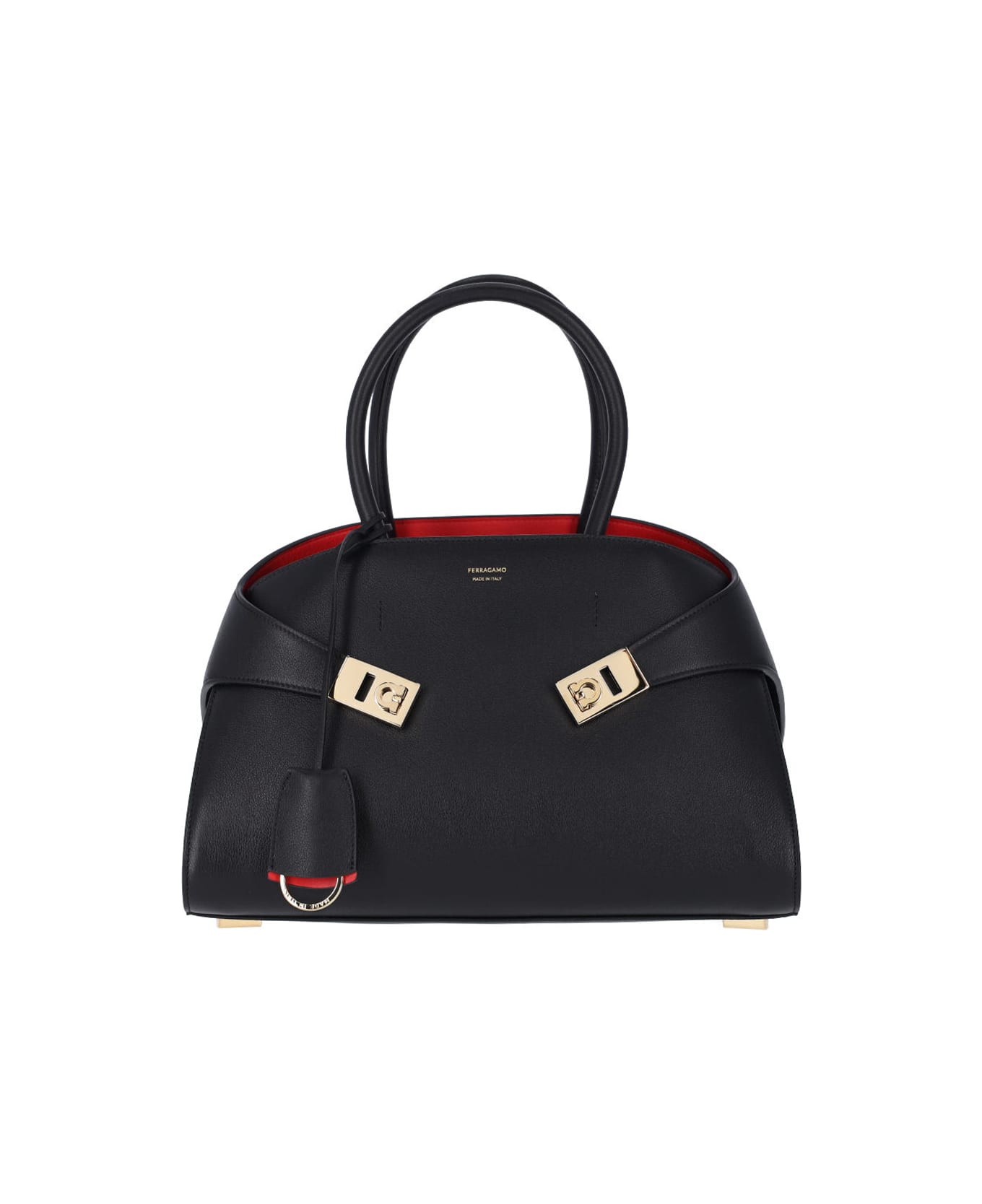 Black calf leather hug handbag, two top handles, strap closure and front "gancini", adjustable and removable shoulder strap, front keyring, gold metal hardware details, inner zip pocket, single main inner compartment.