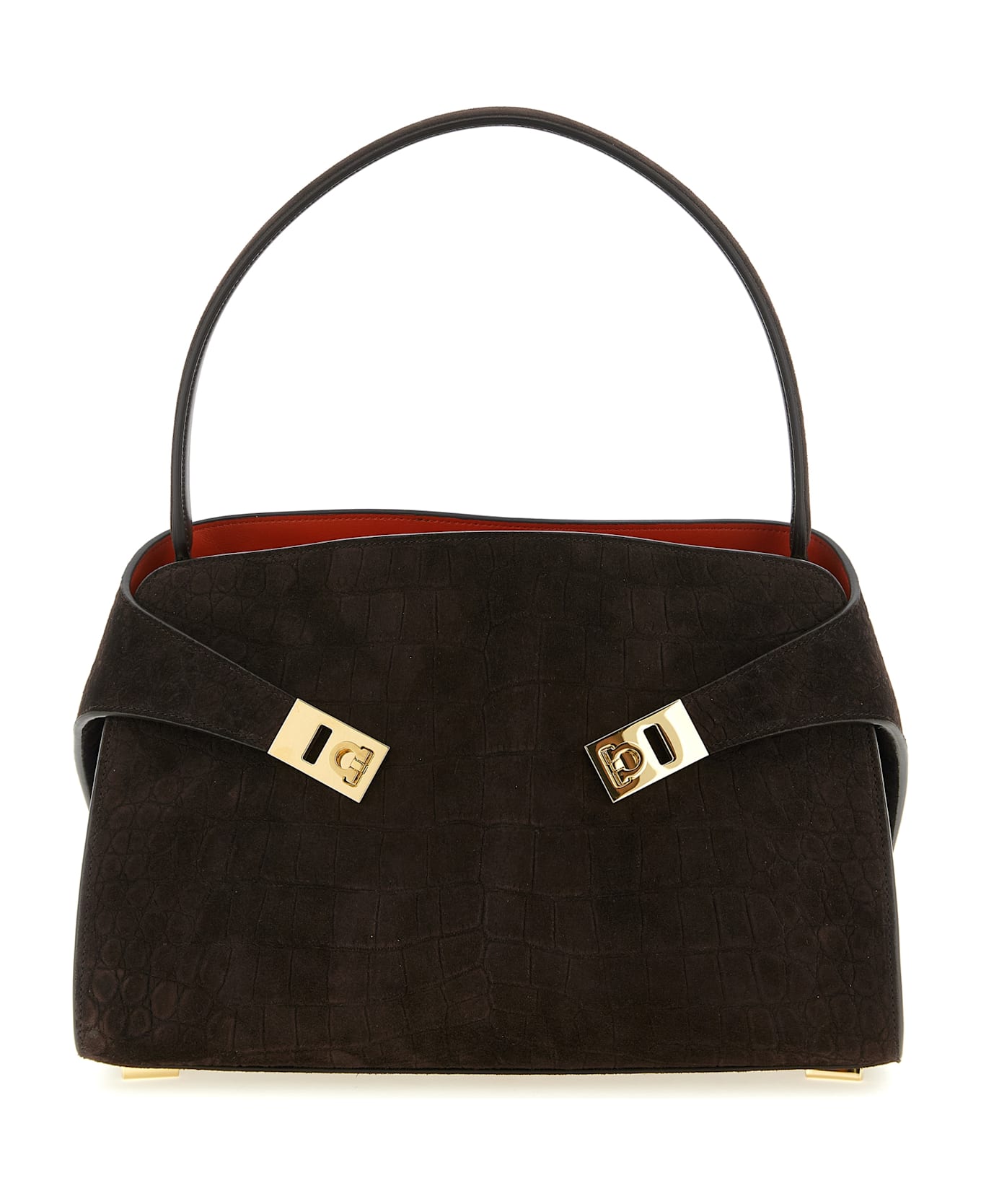 Hug Soft (M)' crocodile-print suede shoulder bag, contrasting smooth leather lining, dial construction, side gussets with metal 'Gancini' decoration, inner flap closure with magnets and T-bar, fixed handle, rigid base with metal feet.
