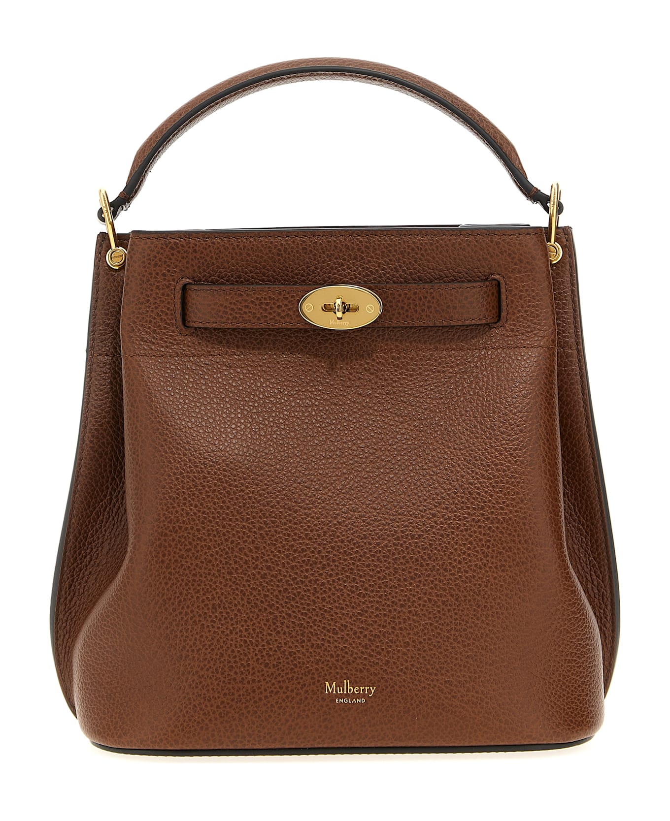 Islington bucket bag in hammered leather with front embossed logo, belt closure with metal Postman's Lock, fixed handle, adjustable shoulder strap, and metal details.