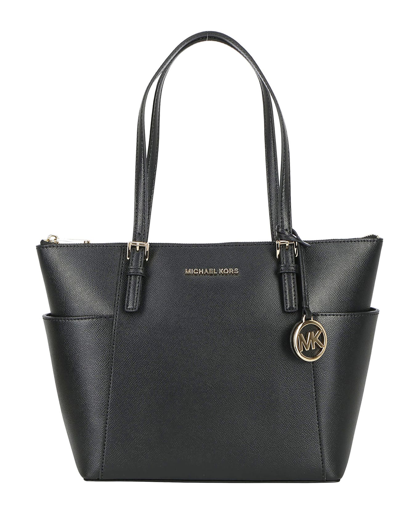 Calfskin jet set tote bag by michael kors, two adjustable slim handles, top zip closure, iconic brand signature embossed in context on the front, iconic brand monogram appliqué on one of the handles, single internal compartment, two internal flat pockets, one zipped welt pocket.