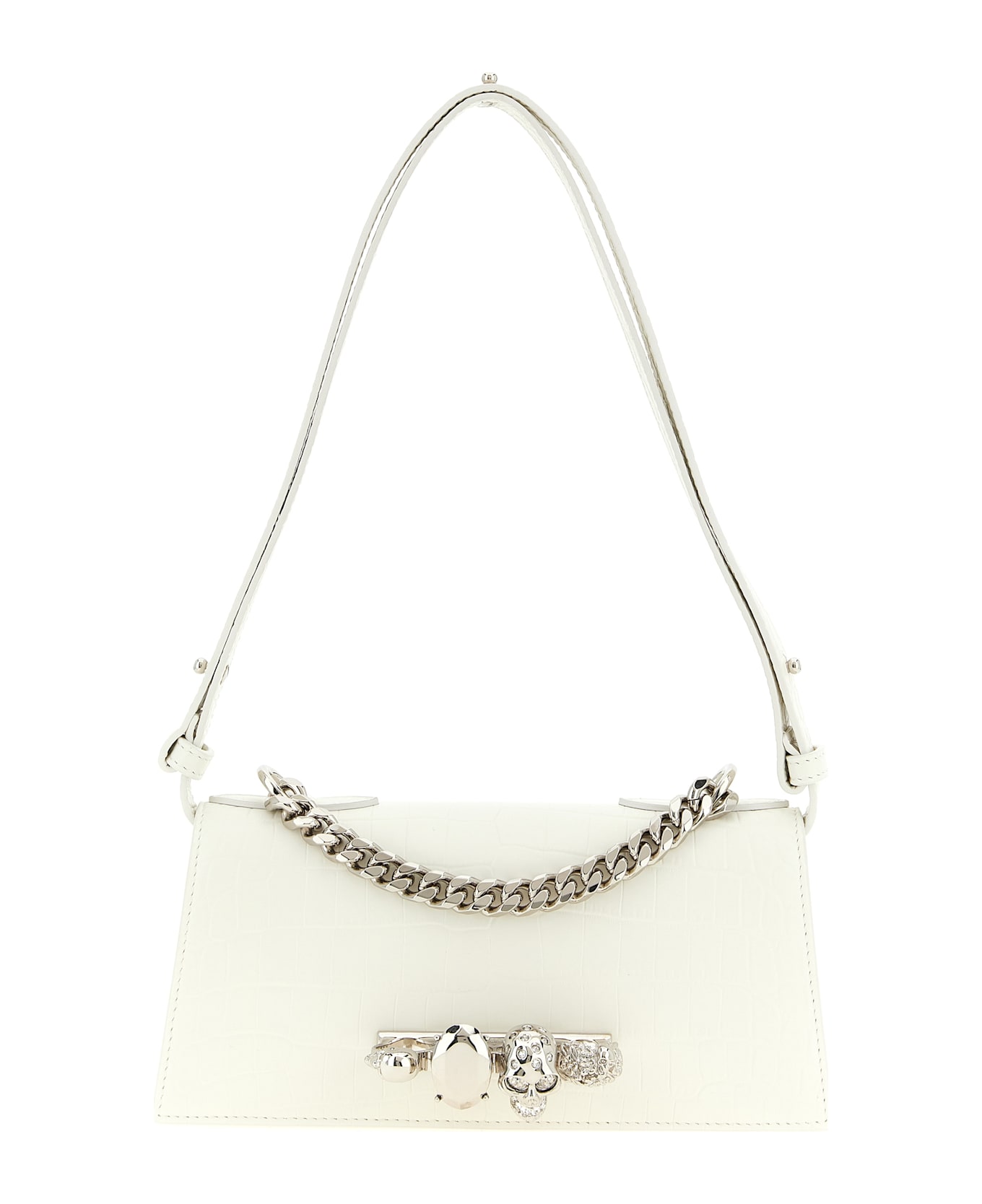 'Jewelled' mini shoulder bag in crocodile-effect embossed print calf leather with semi-matte finish, magnetic flap closure with 'Knuckle' metal detail with the iconic 'Skull' with crystals, fixed chain handle, adjustable and removable shoulder strap. Composition: 100% calfskin leather (Bos Taurus)