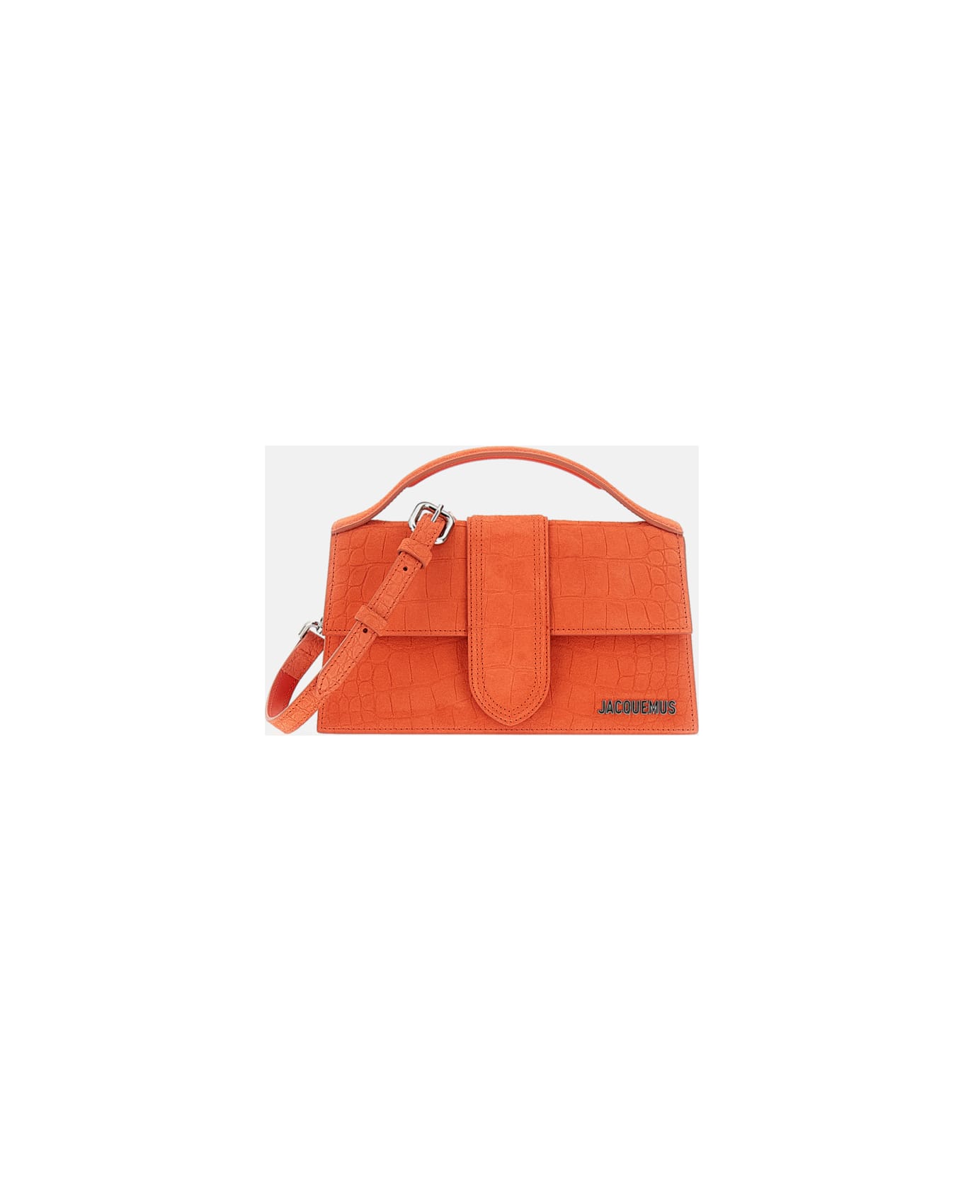 Handbag with flap. Covered in crocodile-effect embossed suede. Padded handle. Magnetic tab closure. Long removable shoulder strap. Back patch pocket. Topstitched details. Silver-tone metal logo and hardware. Fully cotton lined. Color: orange. Made in Italy. Composition: 100% Leather