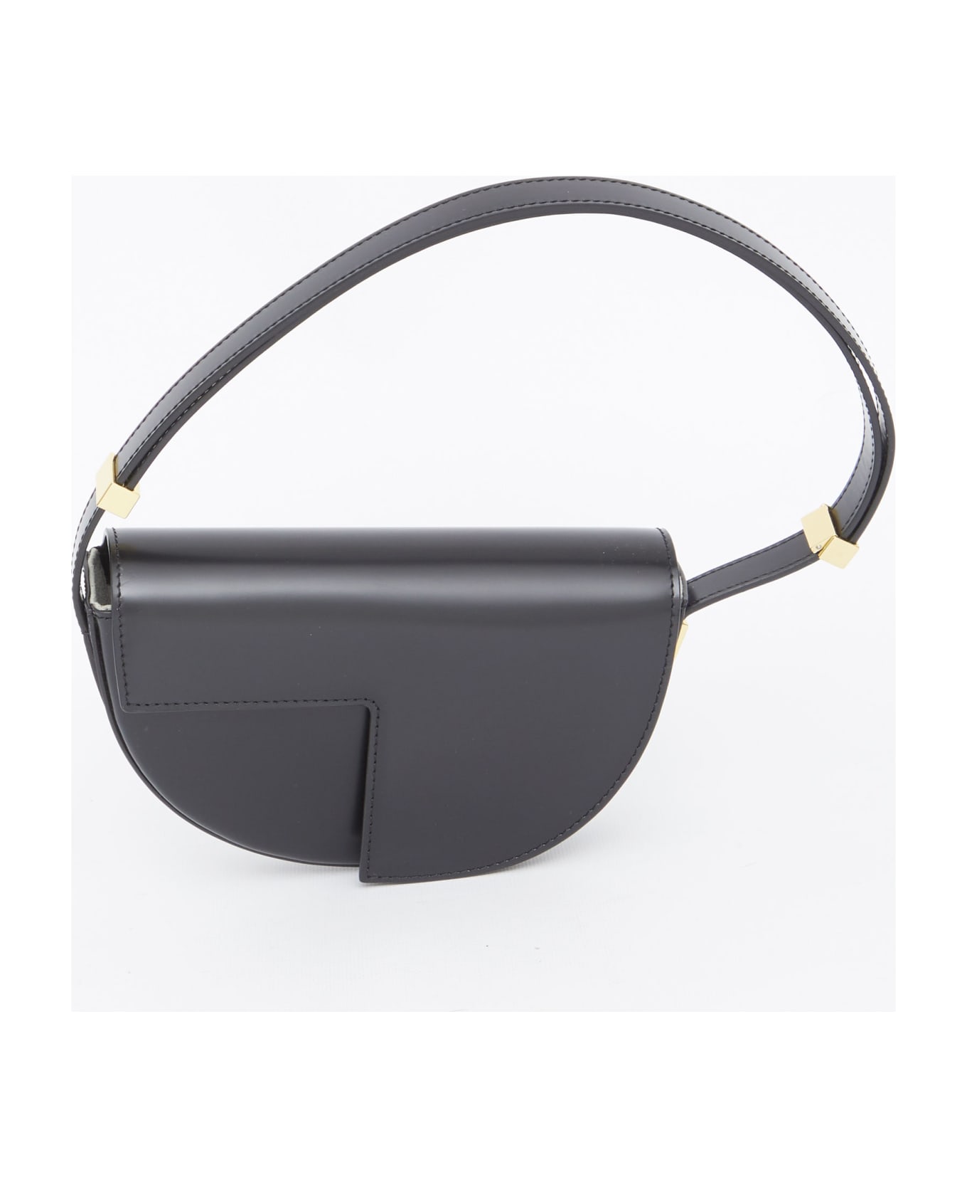 Le Petit Patou bag in black calfskin with geometric design and gold-tone metal hardware. It features adjustable top handle, front flap with magnetic closure, gold-tone metal JP monogram on the front, one main interior compartment and one interior flat pocket. Patou side detail in gold-tone metal.