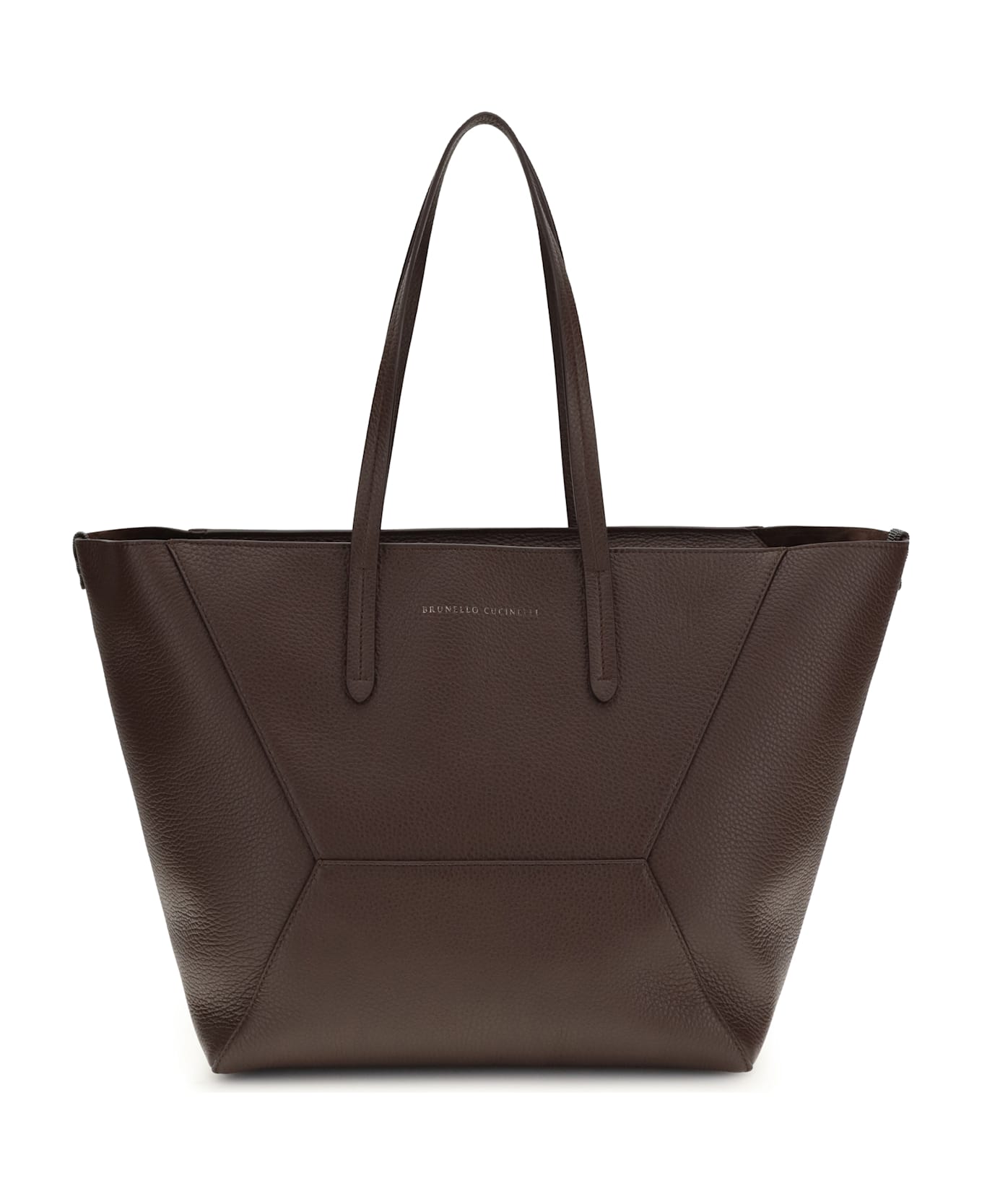 The leather tote bag by brunello cucinelli is an elegant and refined accessory, crafted from hammered leather with a laminated logo print on the front. featuring two flat leather handles and a zip closure, it combines functionality and style, making it perfect for completing sophisticated and everyday looks.