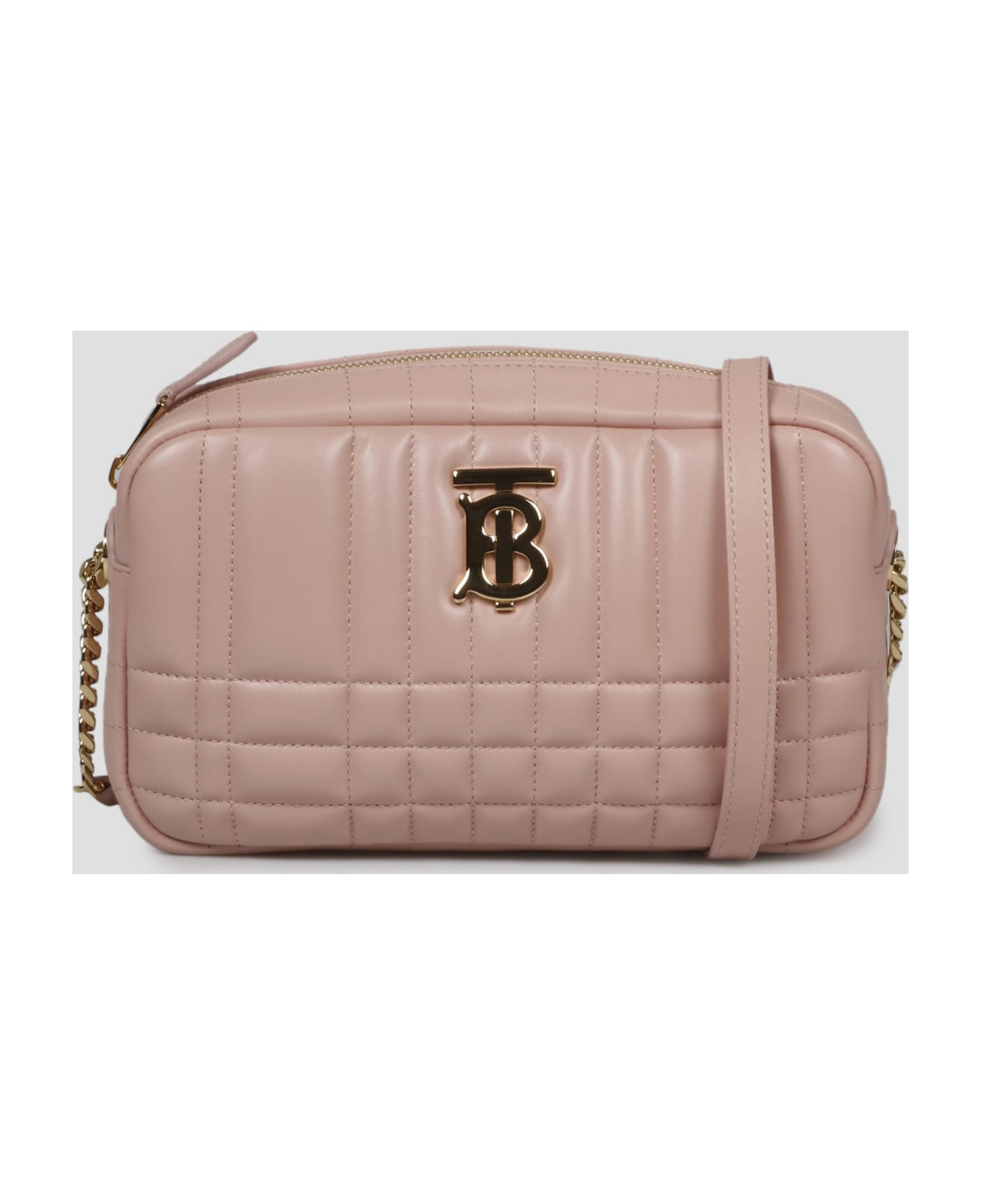 Burberry soft quilted leather camera bag, with TB Monogram on the front. - W:24cm H:15cm D:6cm - Adjustable leather shoulder strap with chain details (Drop: 47. 5-52 cm) - Zip closure - Inner slip pocket - Polished gold-toned metal hardware - Made in Italy - Leather