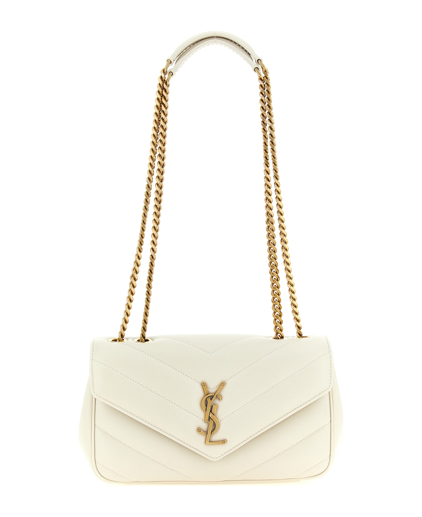 Small 'Loulou' lambskin shoulder bag with chevron quilted stitching, grosgrain lining, magnetic flap closure with antiqued Cassandre metal logo on the front, sliding chain shoulder strap with leather protection, leather clutch bag with removable mirror.
