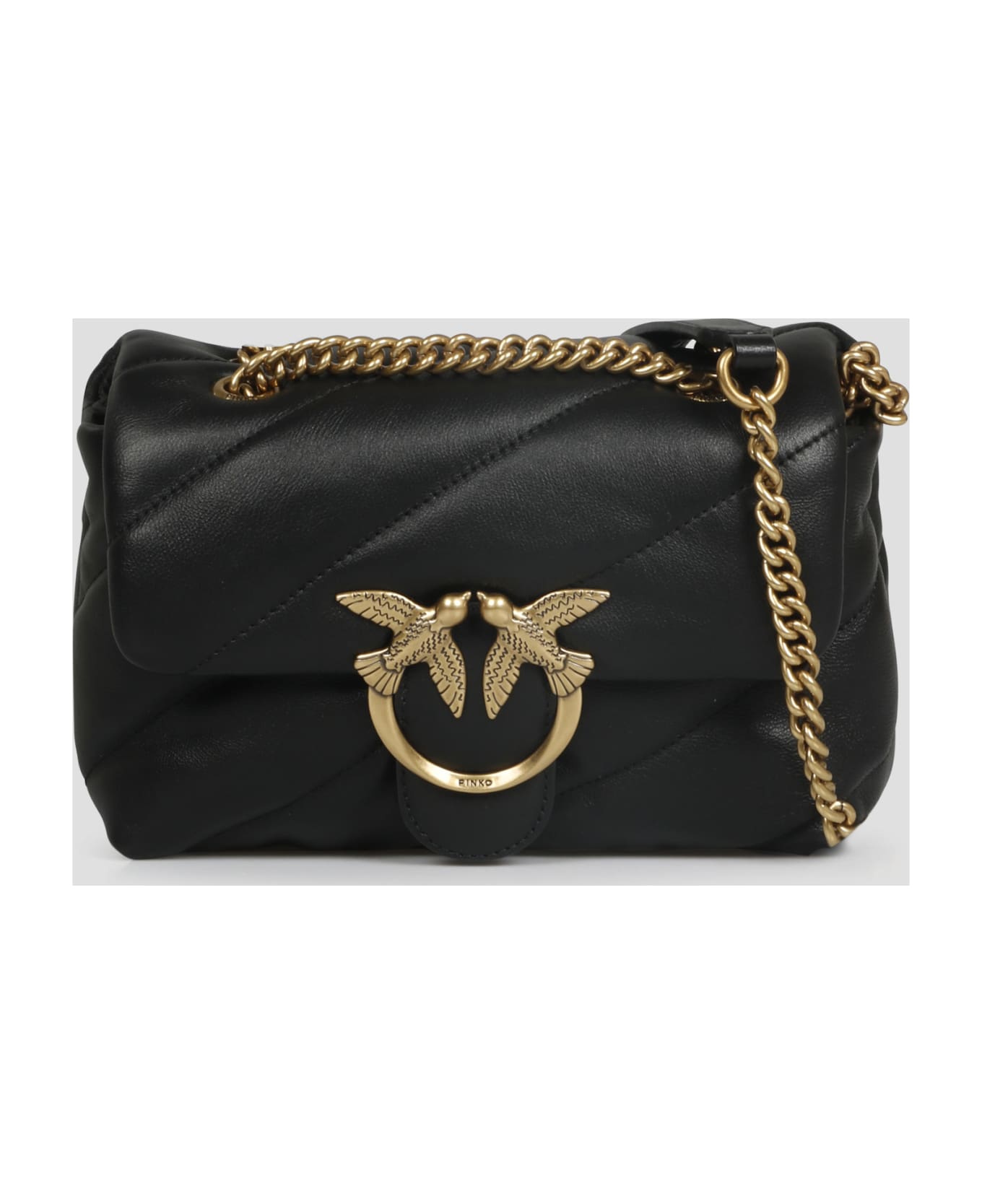 Pinko Mini Love Bag Puff in nappa leather featuring maxi slanted quilting and embellished with the iconic metal Love Birds Diamond Cut buckle. - W: 25cm H: 15cm D: 10cm - Sliding chain and leather shoulder strap - Love Birds Diamond Cut buckle closure - Inside: 2 main compartments, 1 zipped compartment, 1 flat pocket - Made in China - 100%Sheep skin