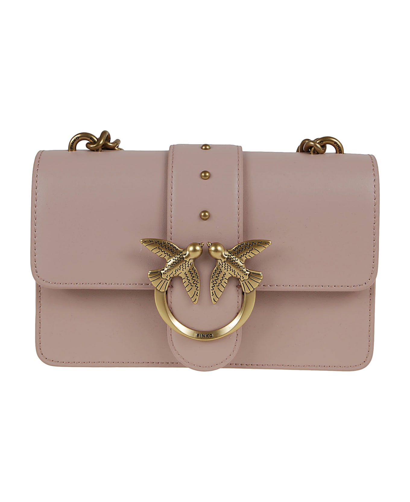 Love shoulder bag in leather by PINKO. Leather pod closure embellished with small studs; one main compartment, interior zip pocket and interior slip pocket. It can be carried both by hand and on the shoulder or shoulder strap thanks to the removable metal chain shoulder strap and a part in leather.
