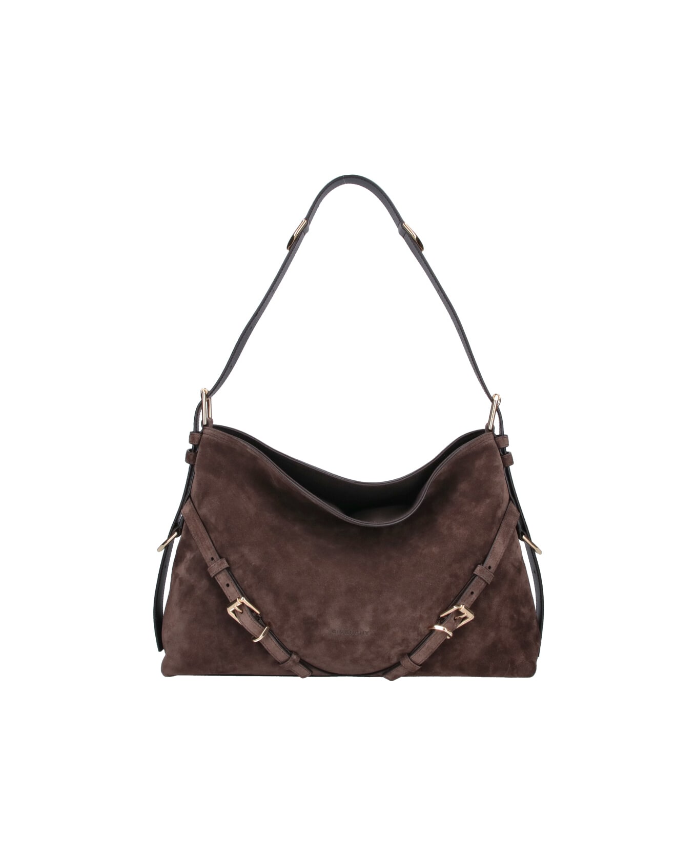 Medium shoulder bag "Voyou" Givenchy, in brown suede, adjustable shoulder strap, closure with adjustable straps at the front, gold logo print at the front, one internal zip pocket, one main internal compartment.